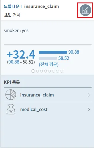 드릴다운Ⅱ는 특정 KPI에 가장 영향을 크게 미치는 변수의 조합을 알려줍니다. 하단의 KPI 목록에서 KPI를 클릭하여 각 KPI의 가장 큰 값을 가져오는 2가지 변수의 조합을 빠르게 확인할 수 있습니다.