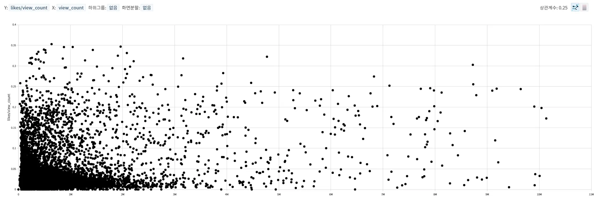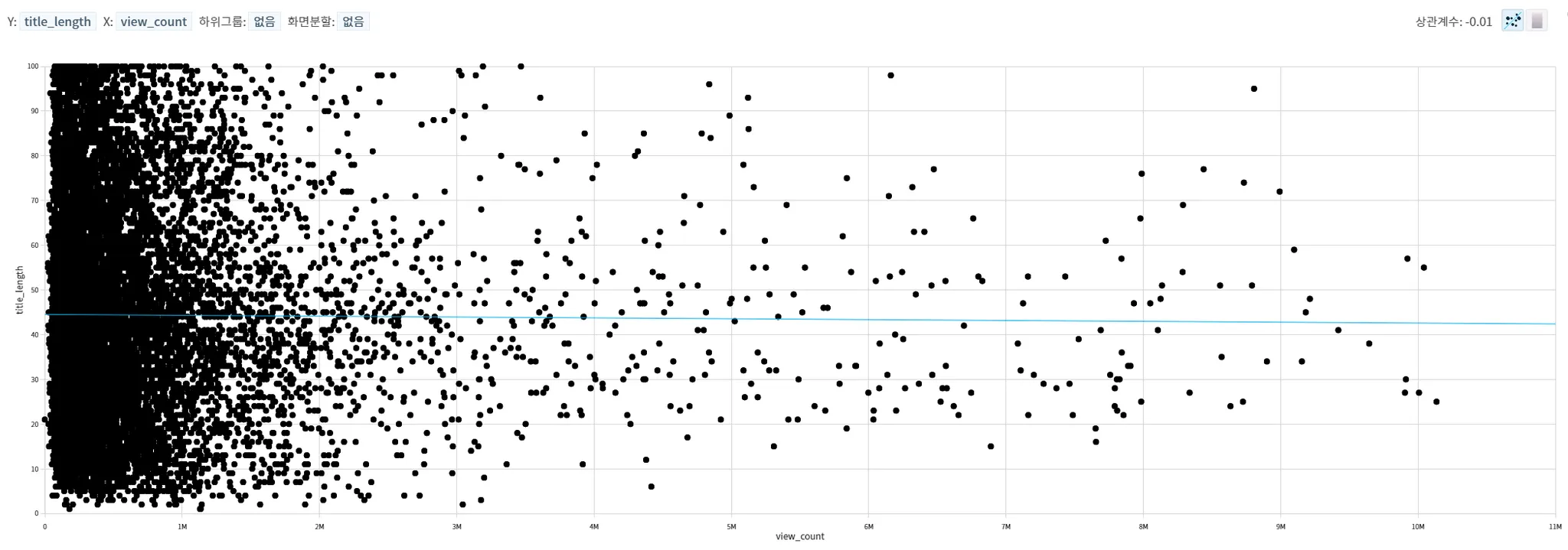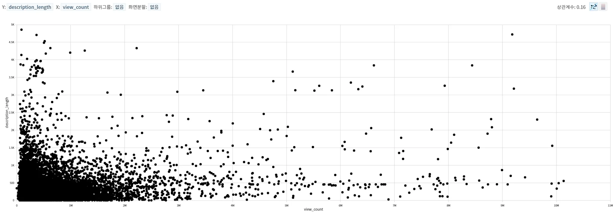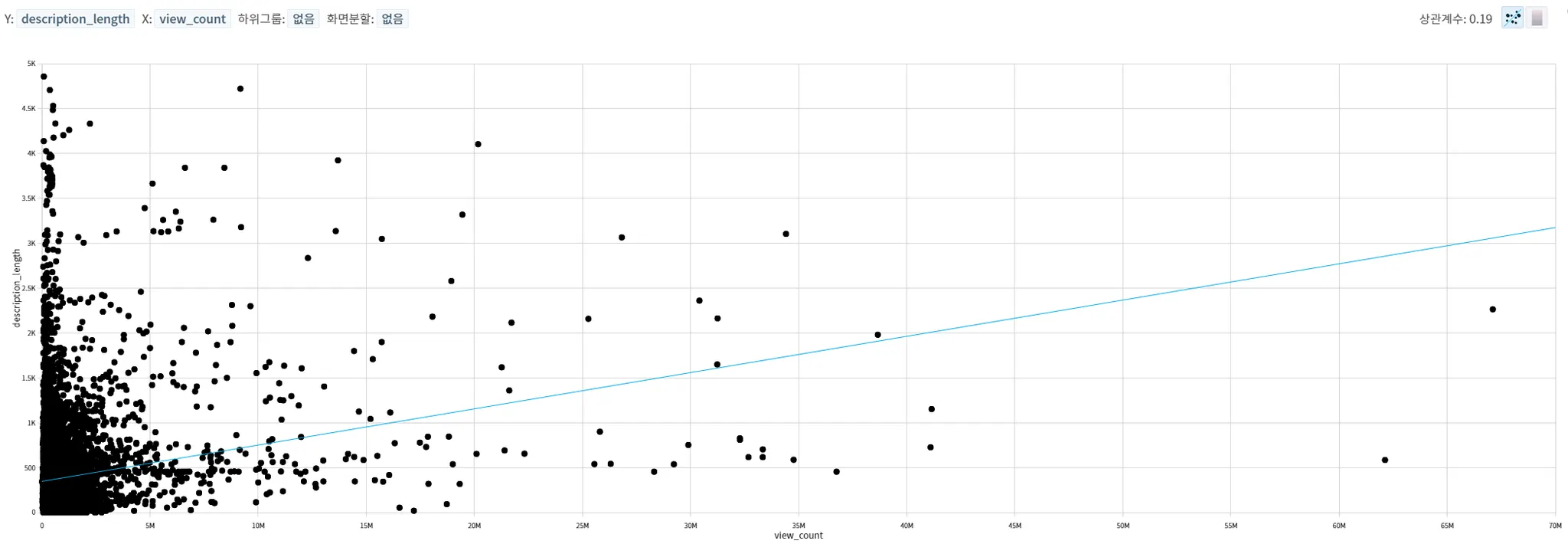 조회수에 영향을 주는 항목들이 무엇인지 알아보기 위한 산점도입니다.