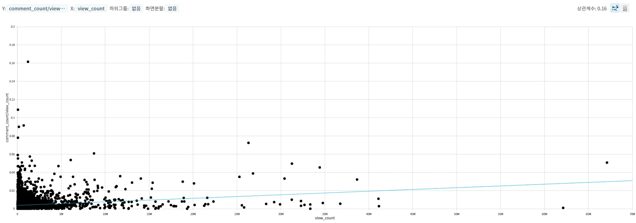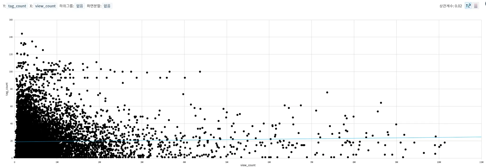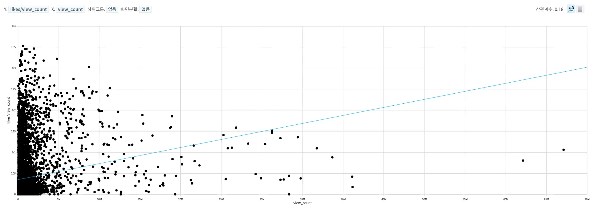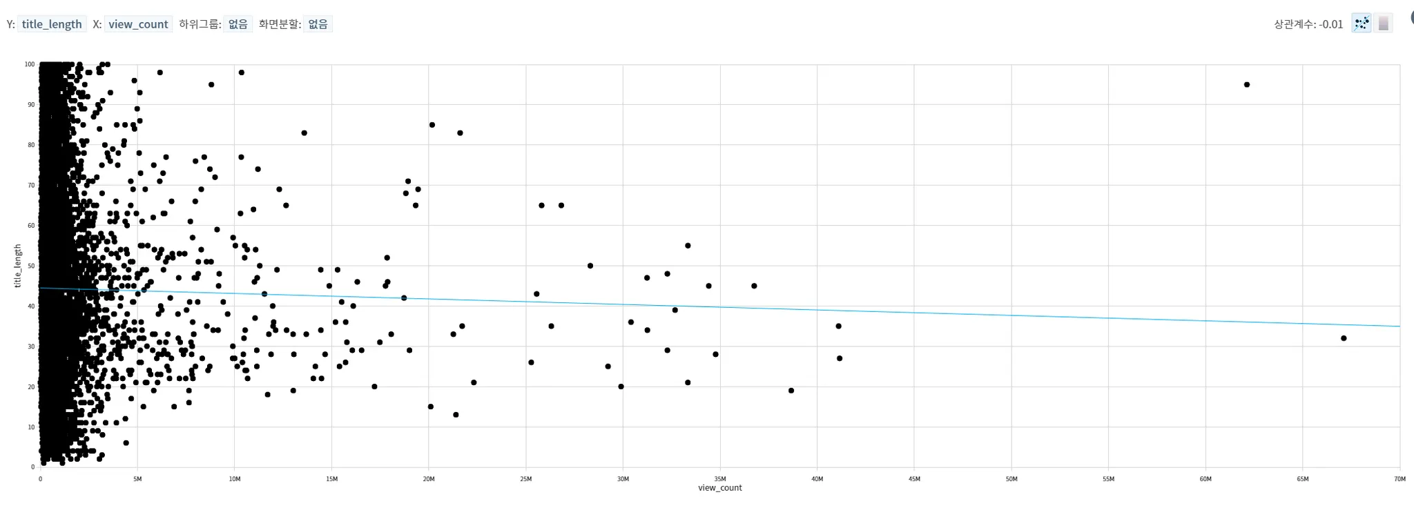 조회수에 영향을 주는 항목들이 무엇인지 알아보기 위한 산점도입니다.