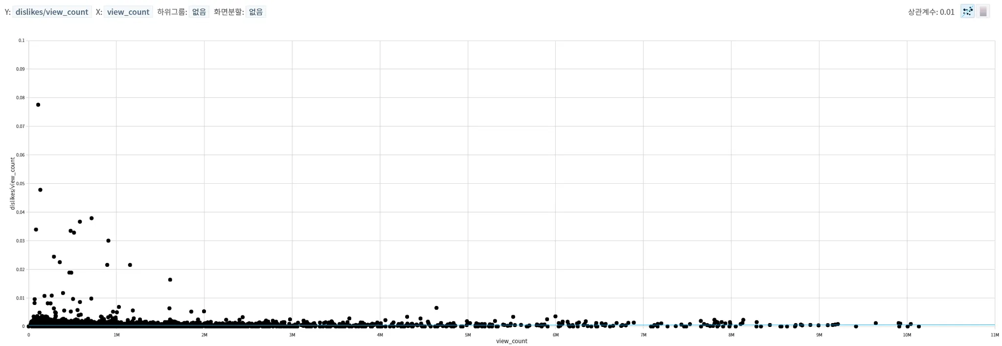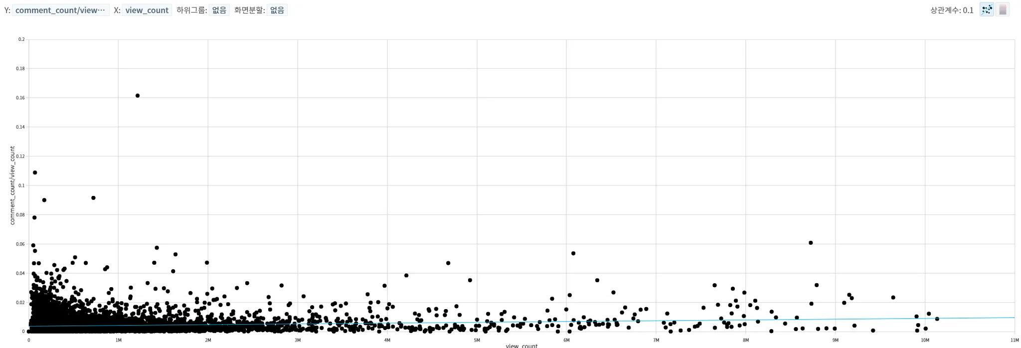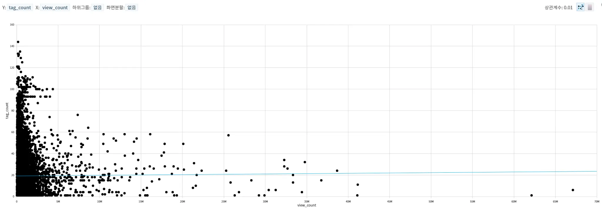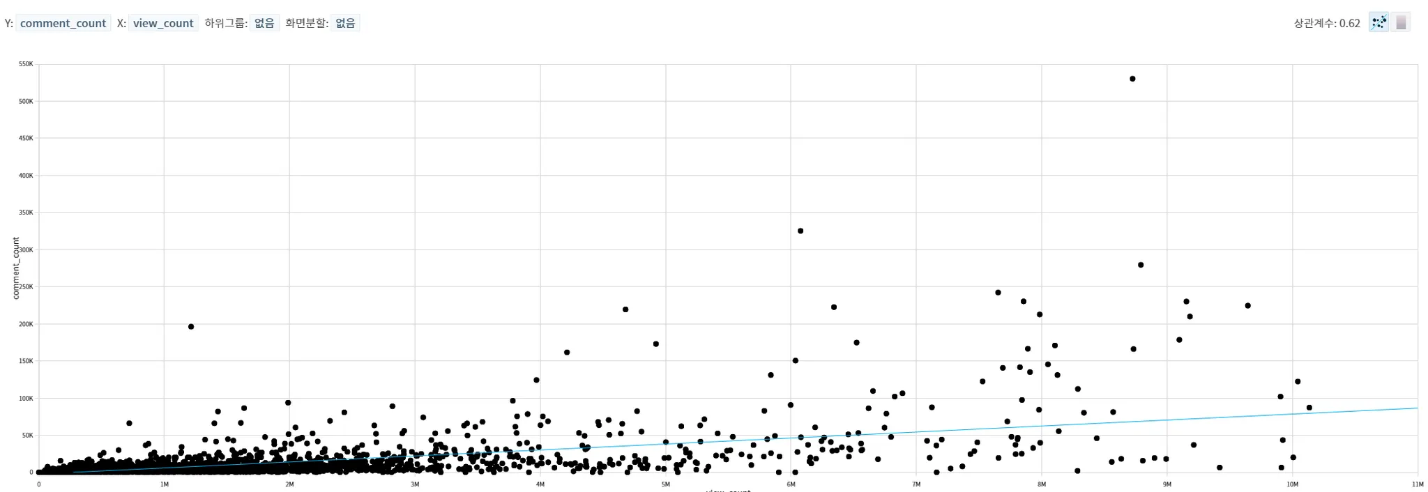 조회수에 영향을 주는 항목들이 무엇인지 알아보기 위한 산점도입니다.