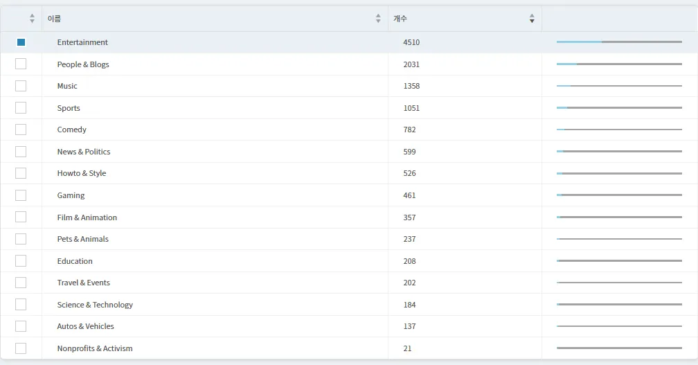 인기 동영상의 70%는 Entertainment, People & Blogs, Music의 카테고리에 속한다.