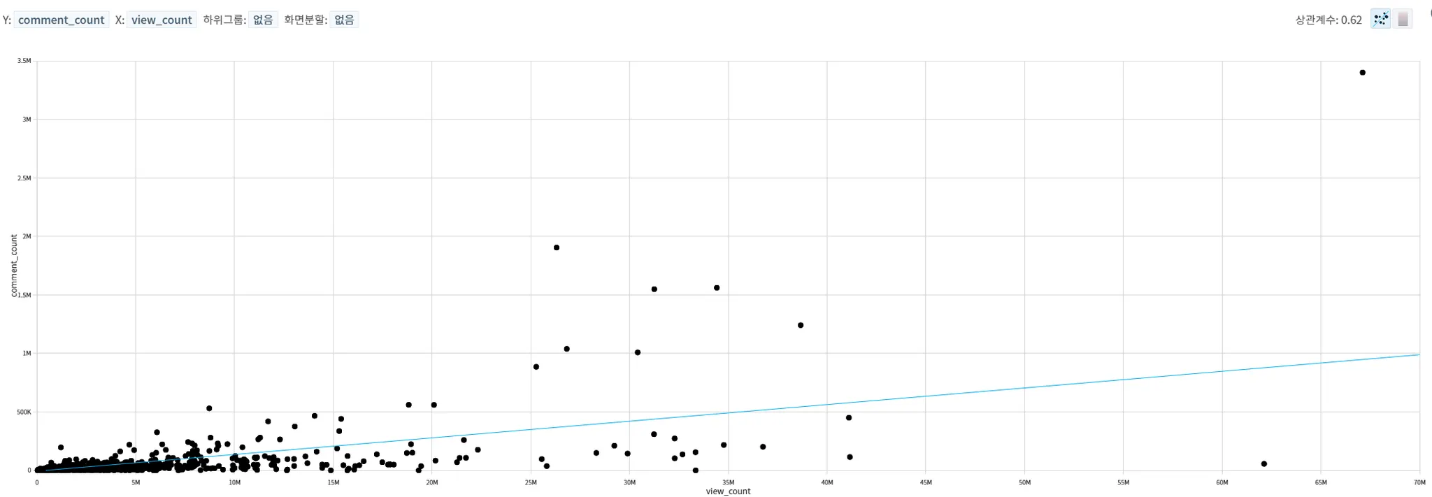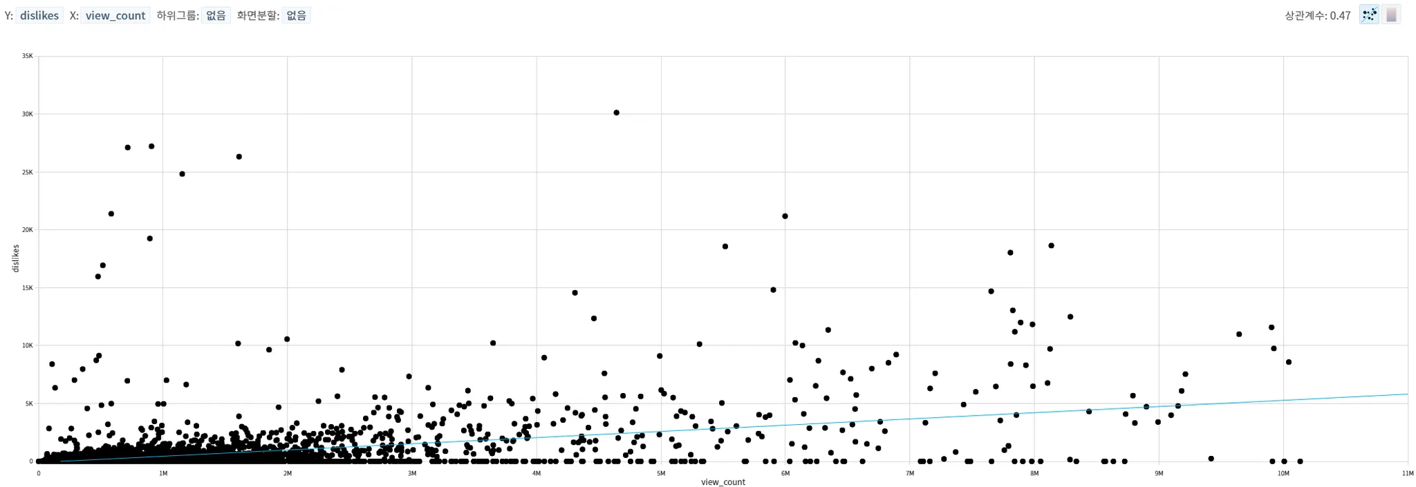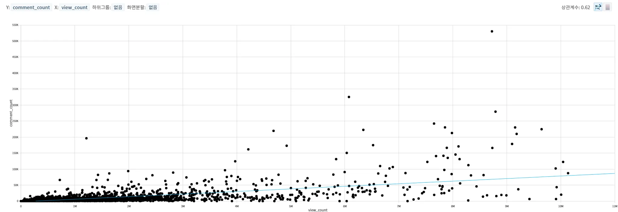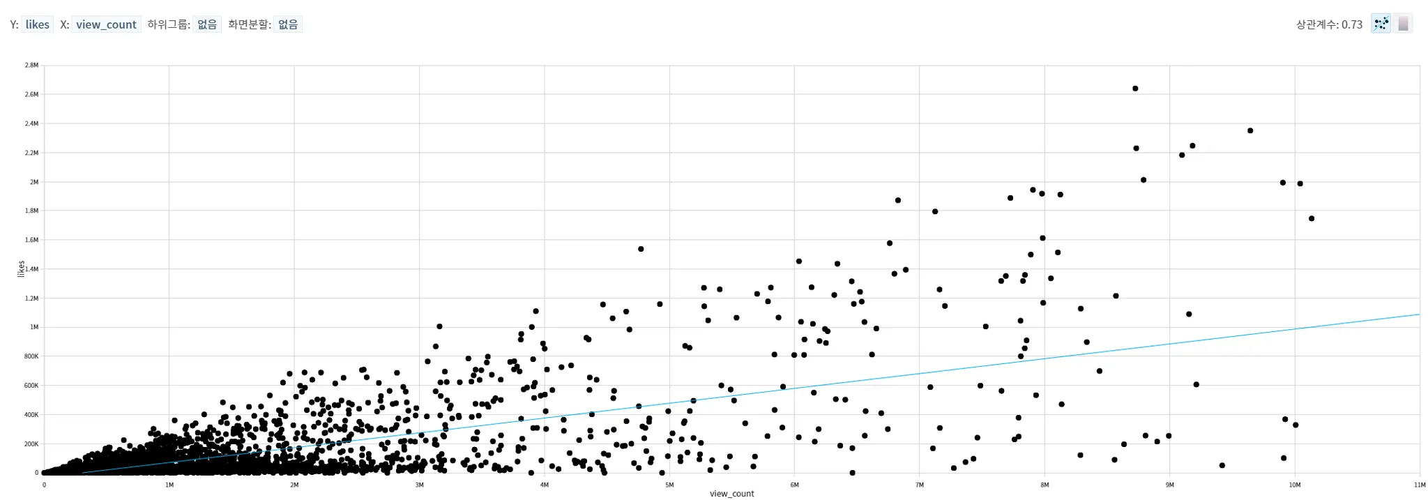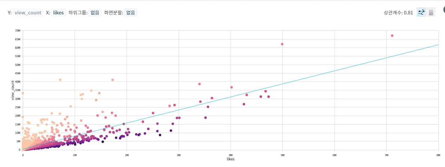 조회수 상위 데이터(조회수 백만 이상 데이터 570개)를 제외하고 그래프를 그려보겠습니다.