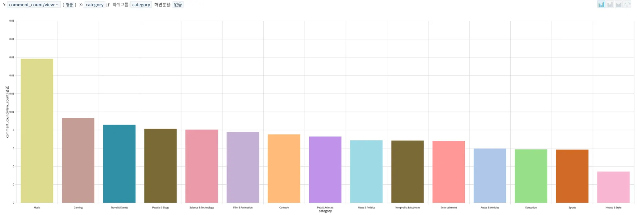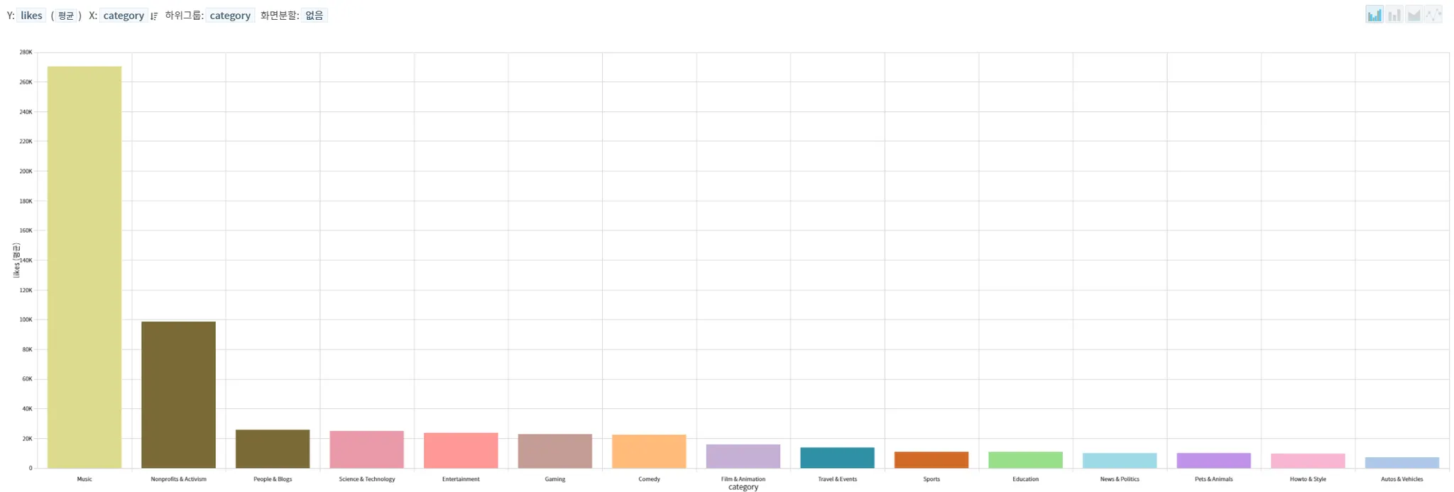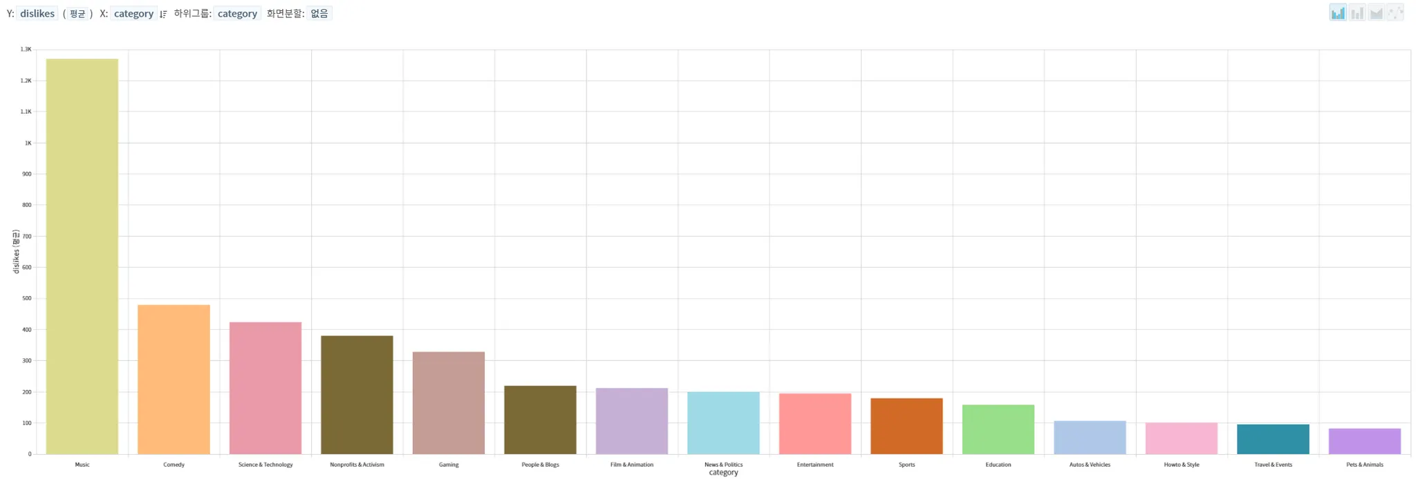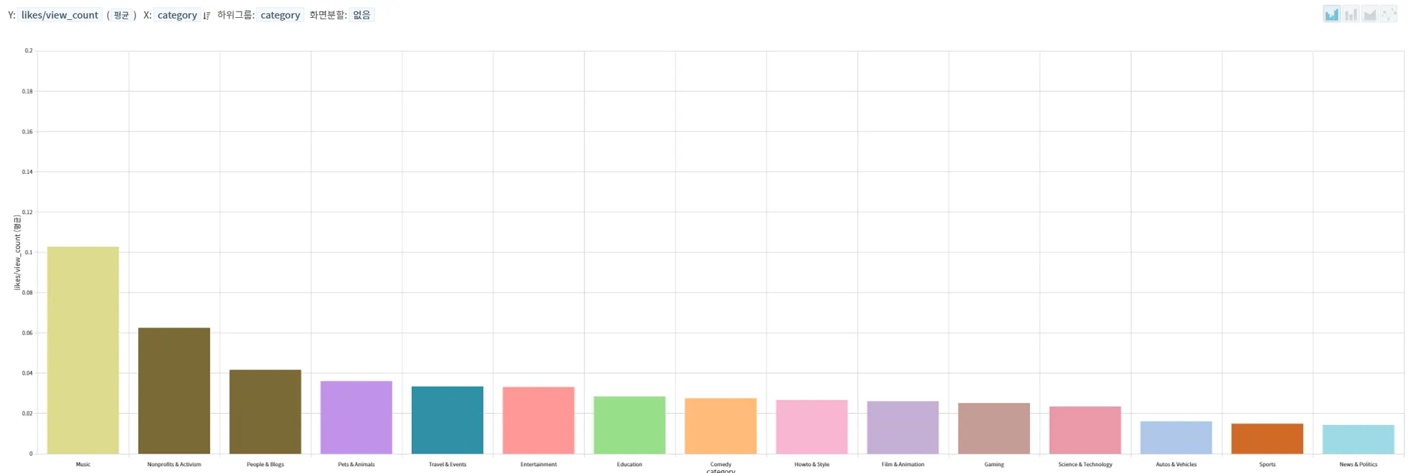 Music 카테고리가 전반적으로 인터렉션 반응이 높다. (싫어요 또한..)