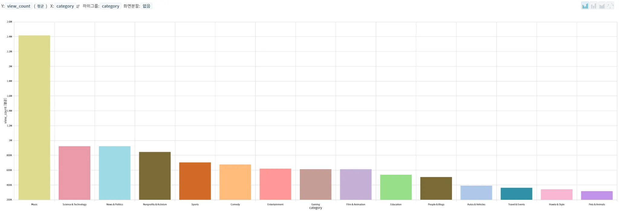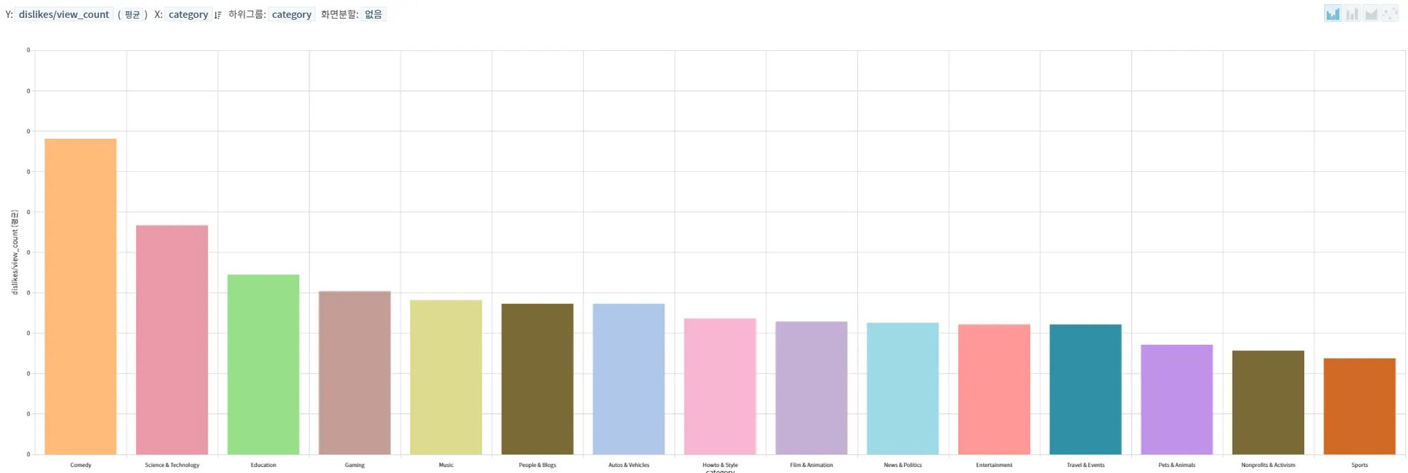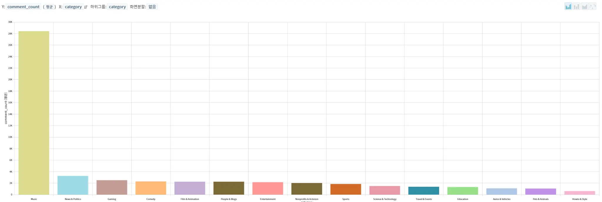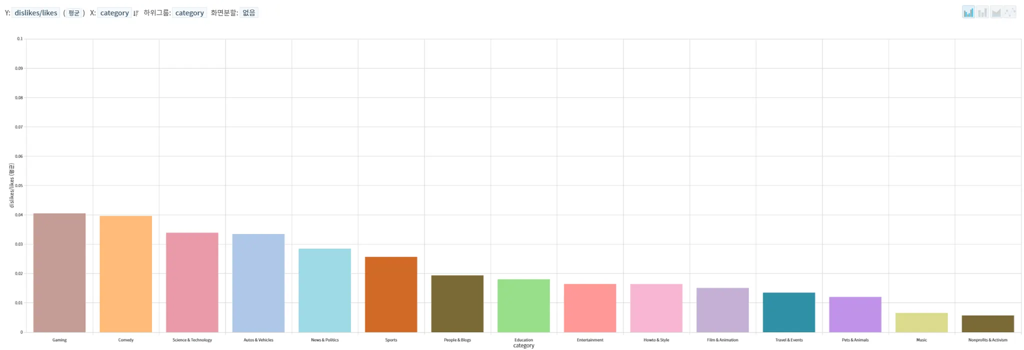 Music 카테고리가 전반적으로 인터렉션 반응이 높다. (싫어요 또한..)
