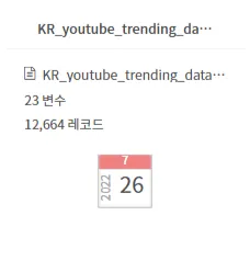분석에 사용한 데이터는 23개의 변수를 가진 인기동영상 데이터 12,664개입니다.