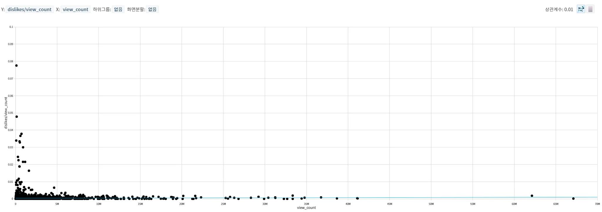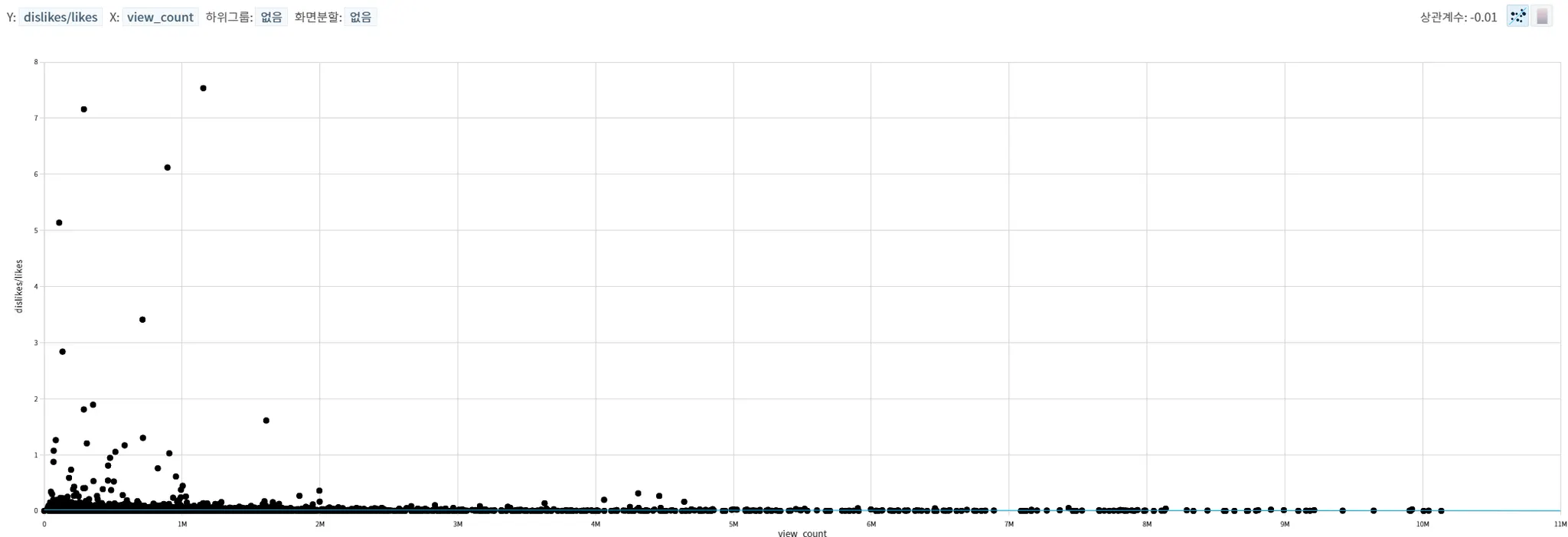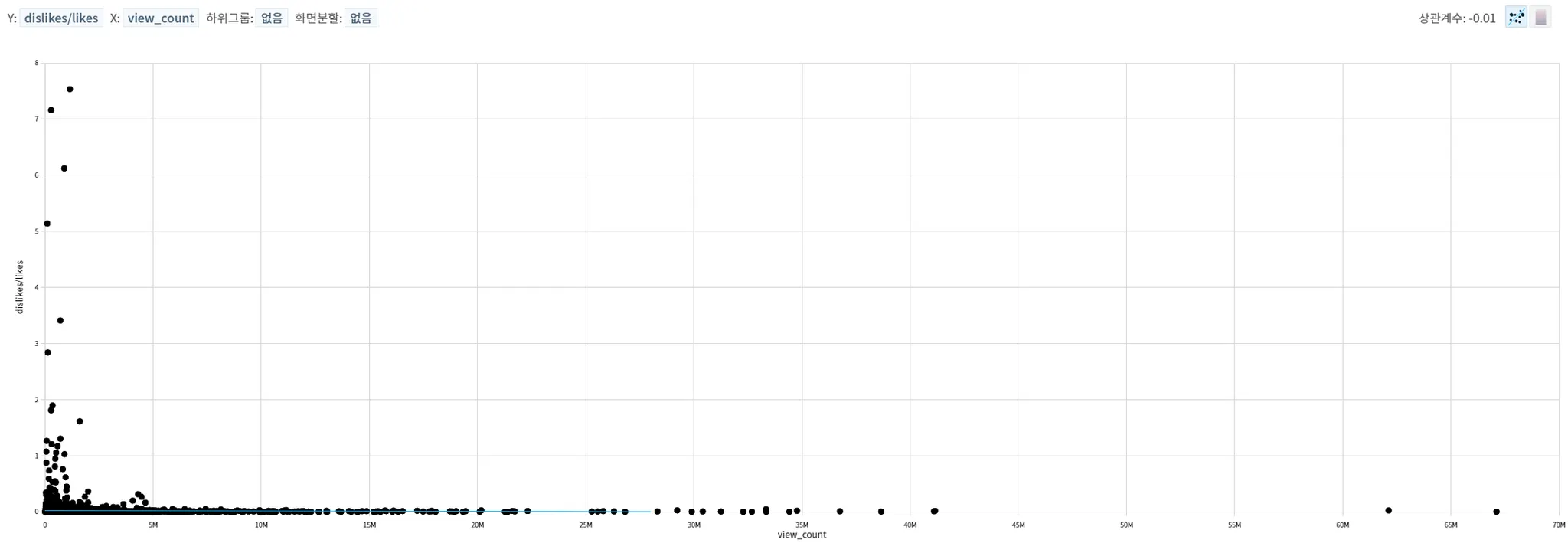 위의 다섯가지 항목에서 파생한 likes/views, dislikes/views, comment_count/views, dislikes/likes 항목들도 마찬가지로 영향이 크지 않을 것입니다.