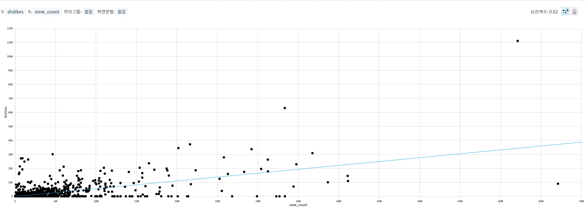 조회수 상위 데이터를 제외한 상관관계입니다. likes, dislikes, comment_count가 각각 0.73, 0.47, 0.62의 상관관계를 가진다고 나타났습니다. 다만 좋아요와 싫어요를 누르거나 댓글을 남기려면 먼저 동영상을 조회해야하기 때문에,조회수가 likes, dislikes, comment_count에 영향을 준다고 해석해야 합니다. tag_count, title_length, description_length가 views와 상관관계가 있지 않을까 생각했었는데, 관계가 없는 것으로 나타났습니다.