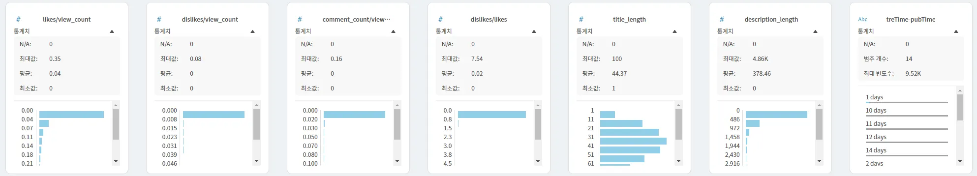 likes, dislikes, comment_count, description_length 네가지 항목은 최소값 항목을 살펴보니 0인 사례들이 있습니다. 각 항목 별로 확인해보았으나 데이터에 오류는 없었습니다. 해당 항목들은 인기동영상이 되는 것에 영향을 주지 않거나, 영향이 작은 것으로 판단할 수 있습니다.