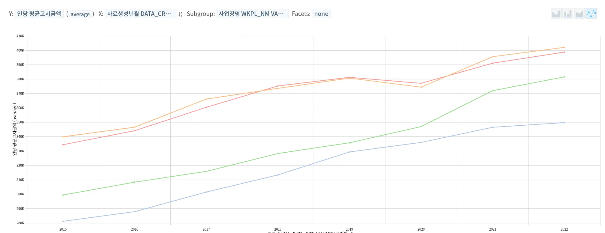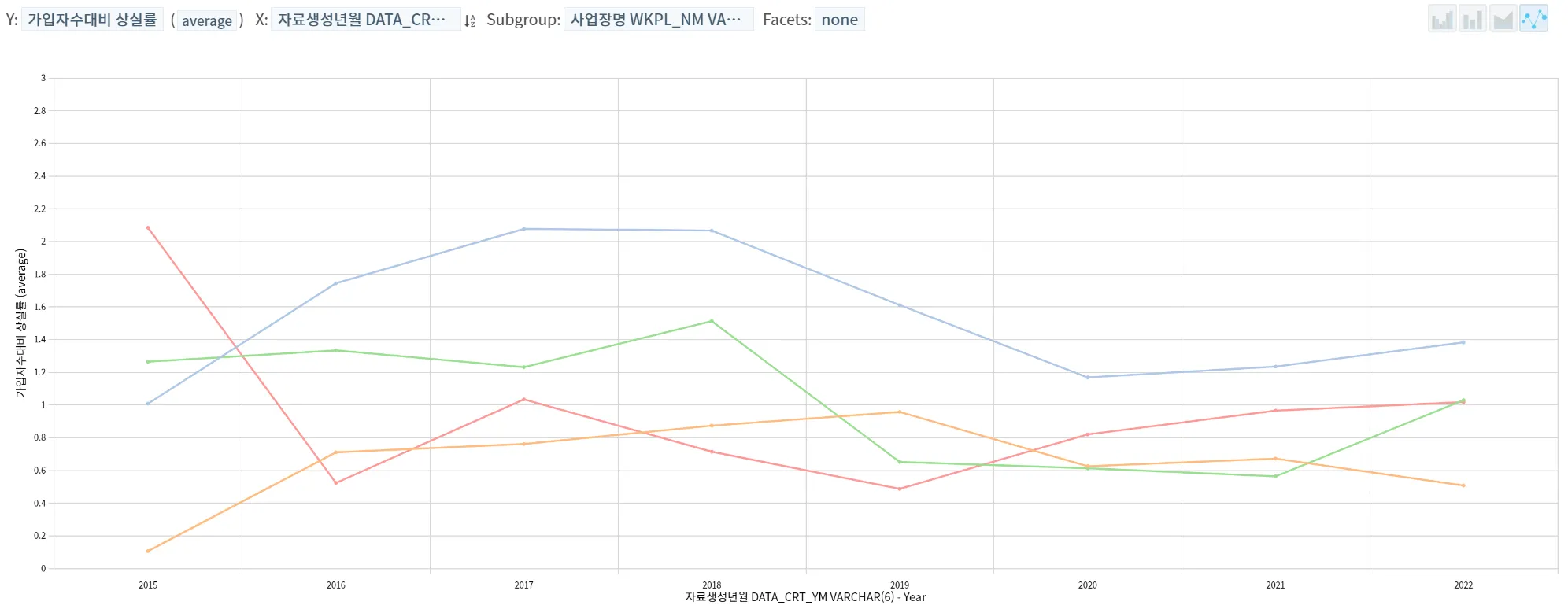 여기서 X기업은 상대적으로 인력 수급에 있어 2015년부터 안정적인 모습을 보여줍니다. 다른 기업들이 2018년에 신규채용을 늘린 것과는 달리 한 박자 늦게 2019년에 채용을 늘렸구요. 또한 초록색 B기업은 2022년에도 채용을 늘리고 있네요.