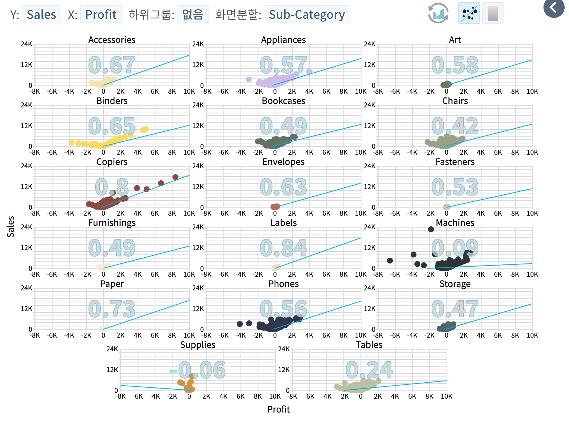 보시다시피 이익(X)과 매출(Y)의 상관관계는 세부 상품군(화면분할 변수) 수준에서 나누어 보았을 때, 상관관계가 여러 단계로 나누어지는 것을 알 수 있습니다. Supplies의 경우는 매출이 이익 증진에 영향을 주지 못했을 가능성이 보이는 것이지요. 이 경우에는 Supplies에 대해 더 자세한 분석이 필요할 것입니다. 해당 데이터셋에서도 이러한 분석을 추가적으로 시행해 보면 좋겠네요.