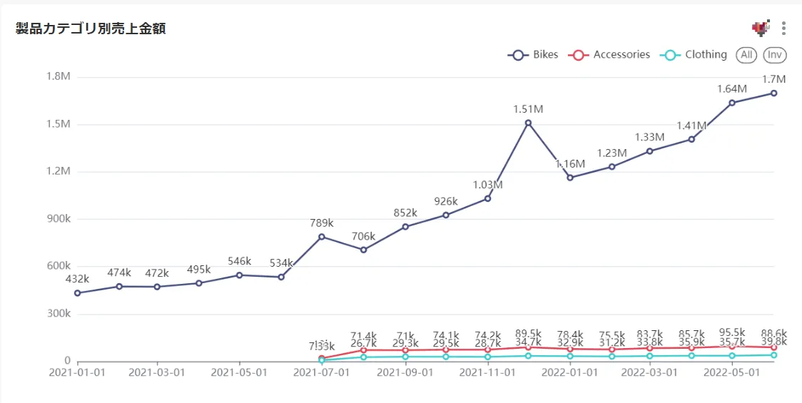 1. [リッチツールチップ] をチェックすると、折れ線上にマウスを置いた際に表示されるツールチップですべてのカテゴリが表示されます。