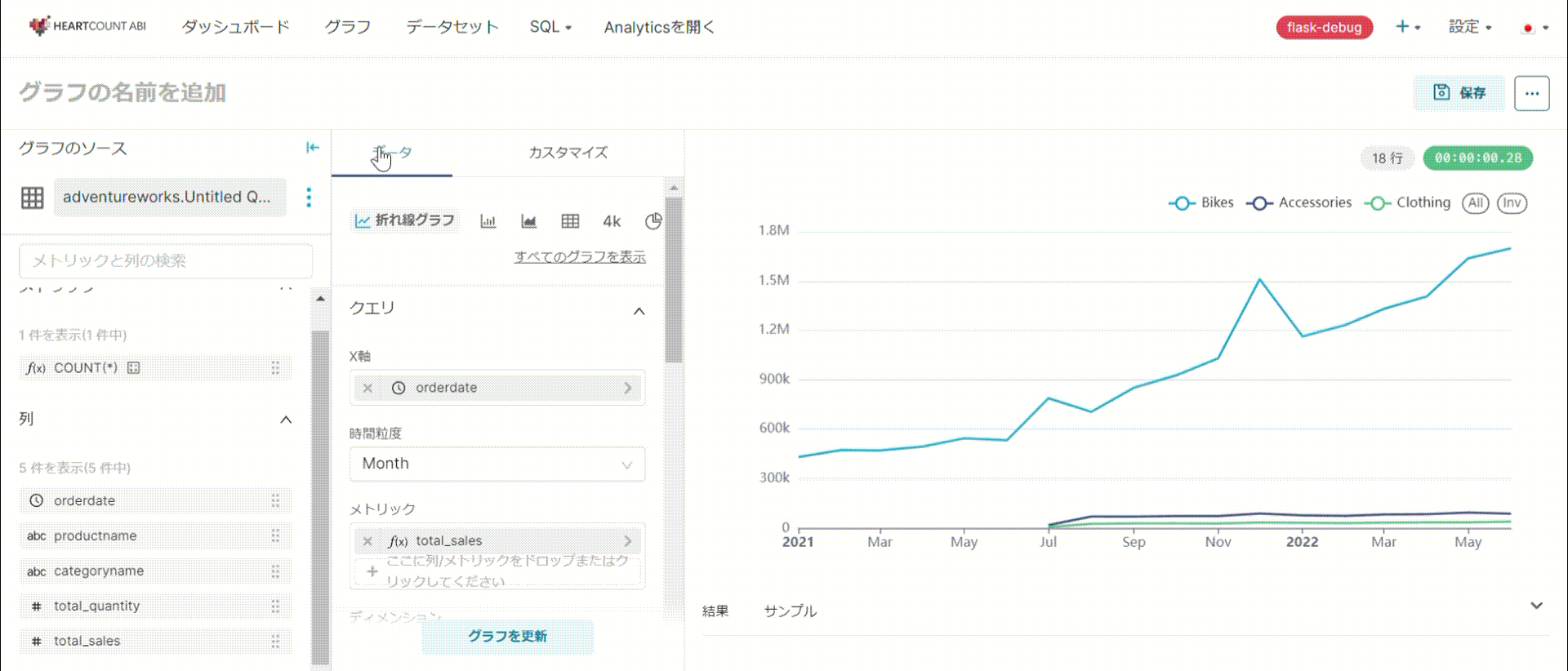 [時間] と [クエリ] のパネルでグラフに表示する時間とメトリックなどを設定します。