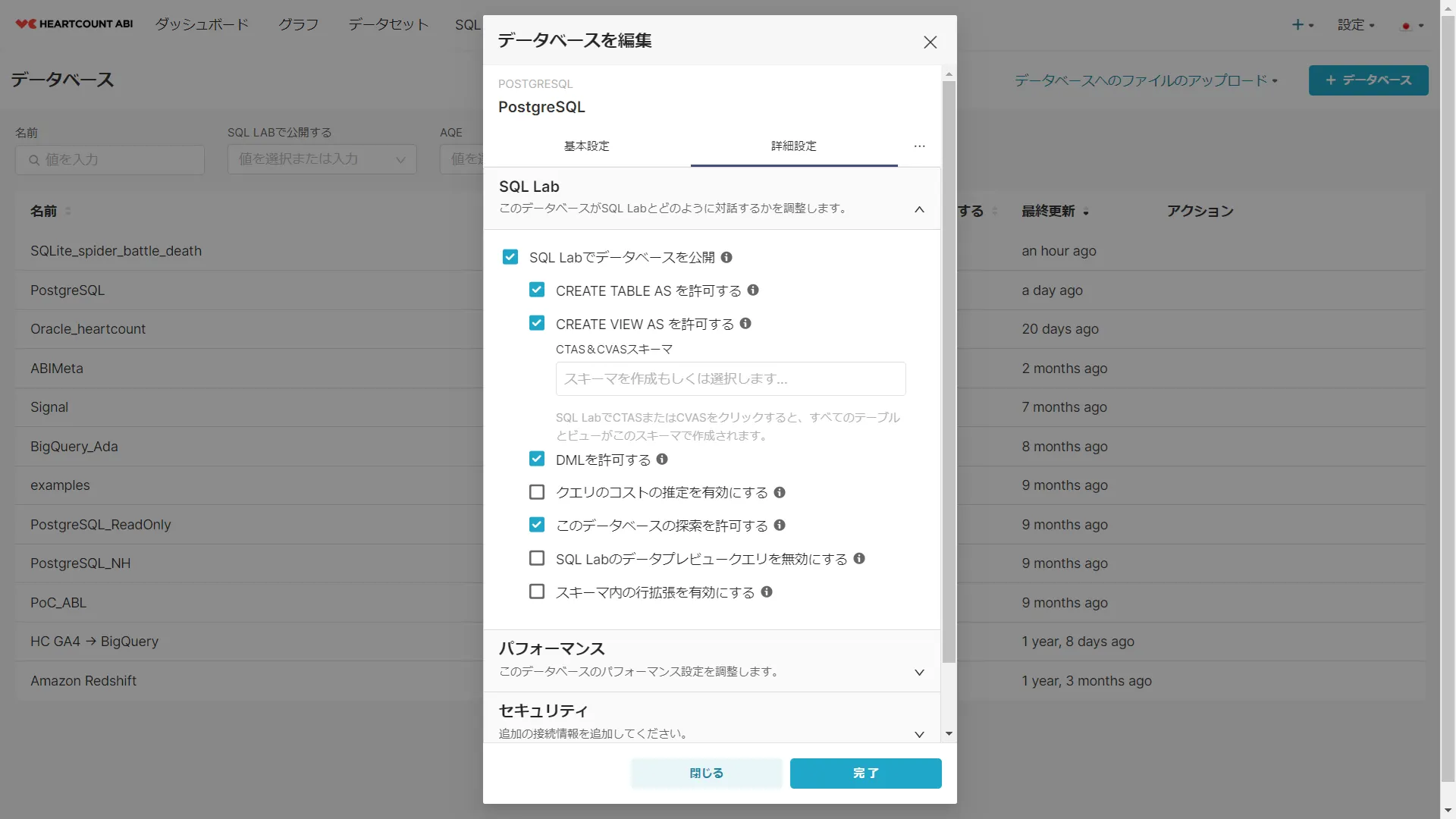 作成されたテーブル・ビューを保存するスキーマを指定する画面 ([設定] - [データベース接続] - [編集] - [詳細設定] - [SQL Lab] - CTAS&CVASスキーマ)