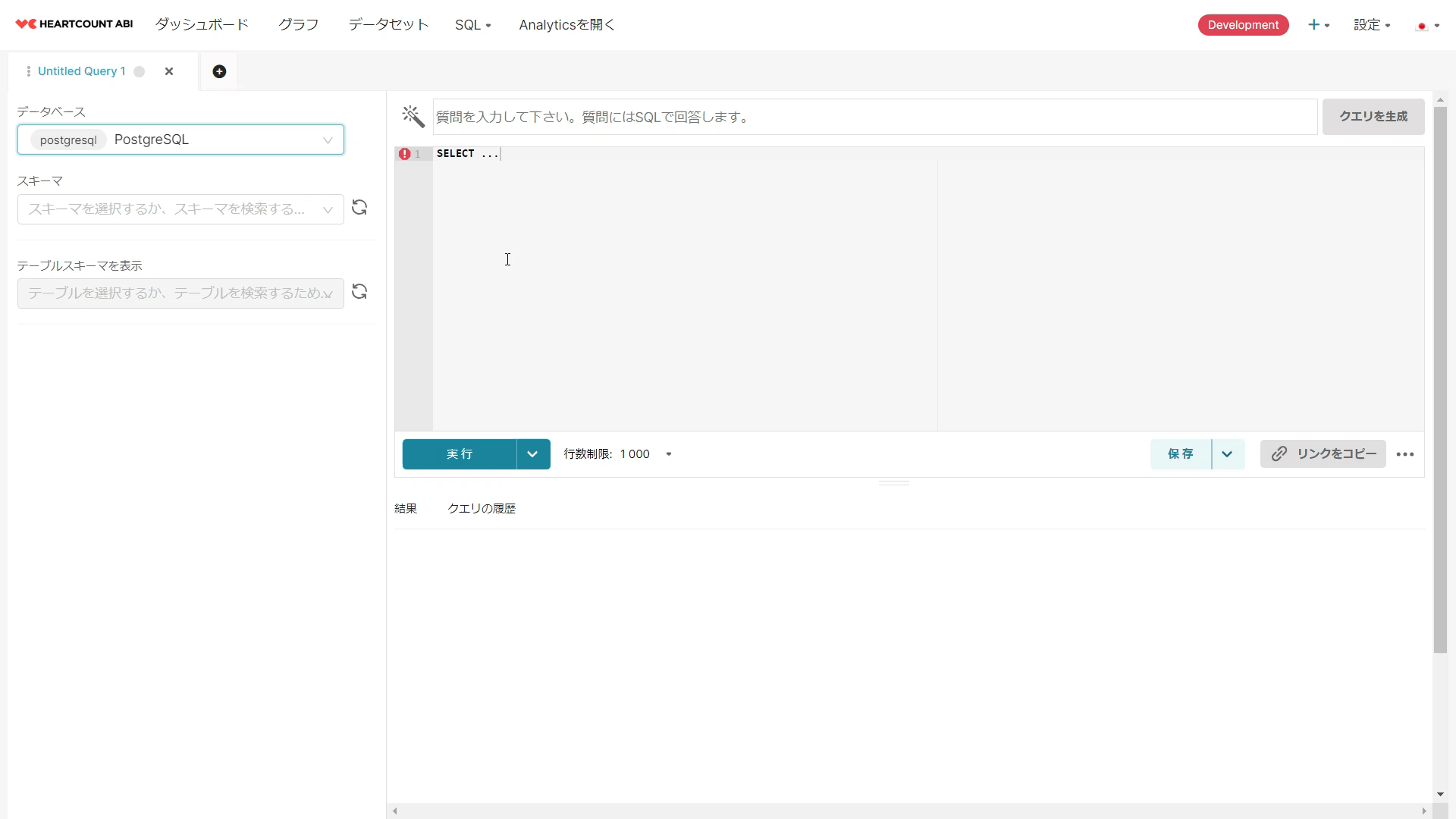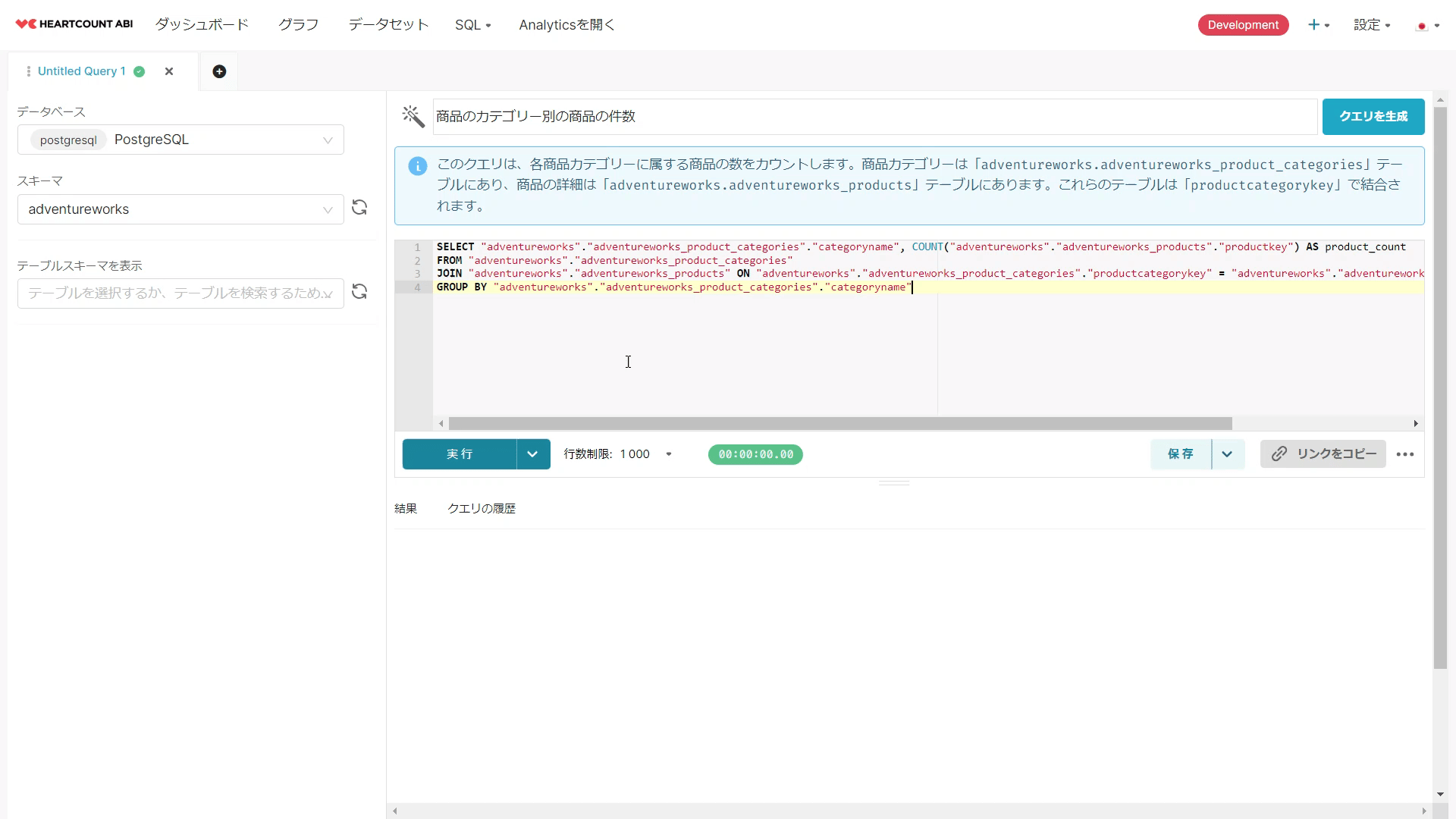 保存: 作成されたクエリが HEARTCOUNT ABI に保存されます。保存されたクエリは、トップメニューバーの [SQL] - [保存済みクエリ] から確認することができます。