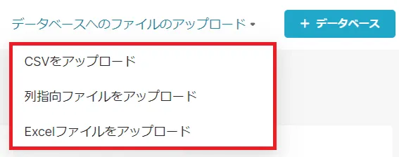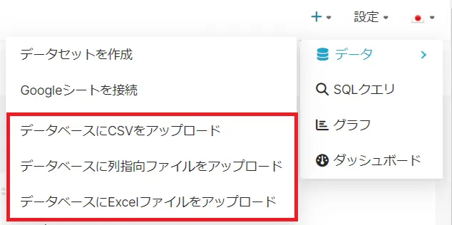 - 方法 1. (画面右上) 設定 ▾ → データベース接続 → データベースへのファイルのアップロード ▾ → アップロードするファイルを選択