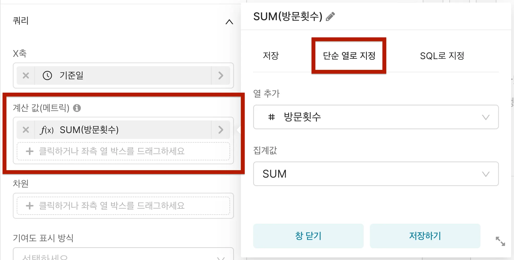 “단순 열로 지정(Simple)”에서 SUM, AVG, COUNT로 집계했을 때 버튼이 활성화됩니다.