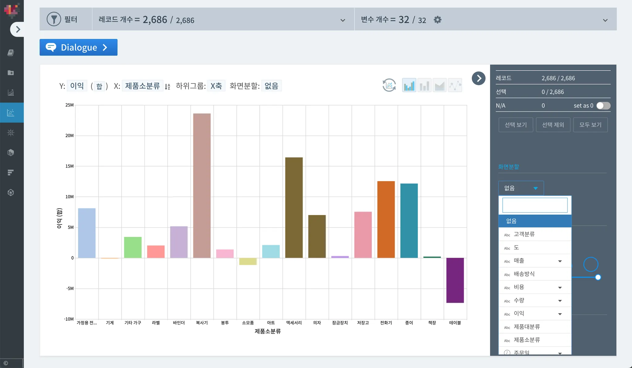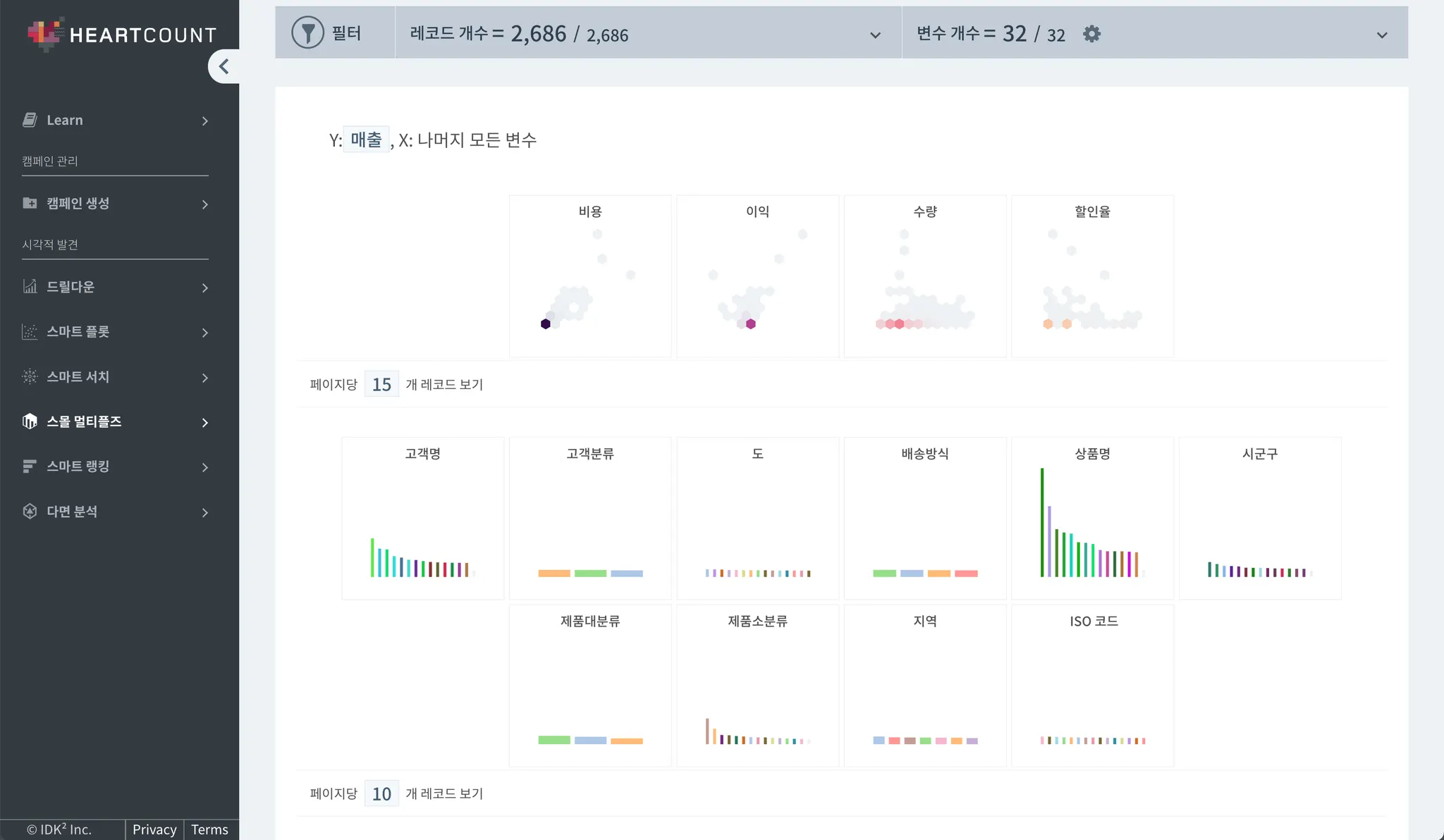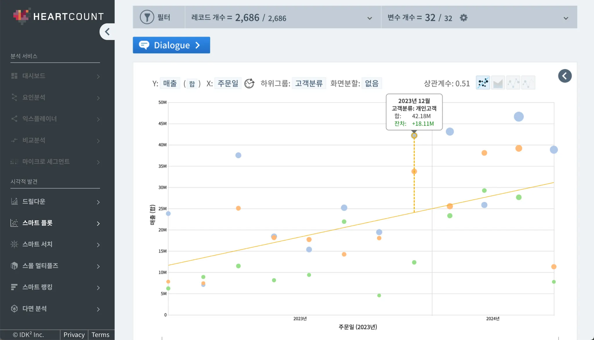 데이터셋을 이용해 상관분석과 같은 간단한 분석부터 사용자가 선택한 KPI에 대해 중요도가 높은 요인(변수)을 찾아주는 요인분석과 같은 복잡한 분석을 쉽게 진행할 수 있는 데이터 분석 툴입니다.