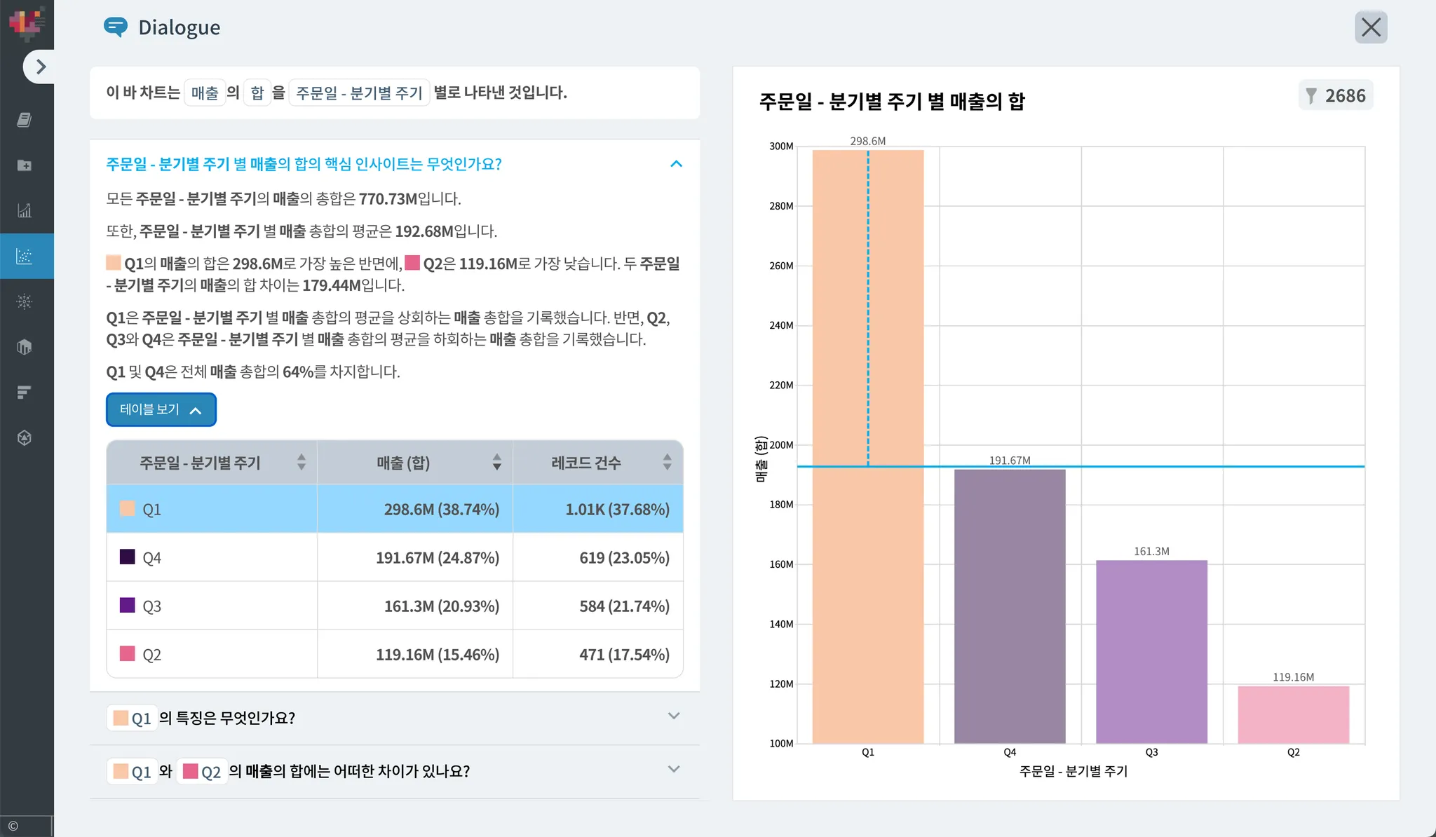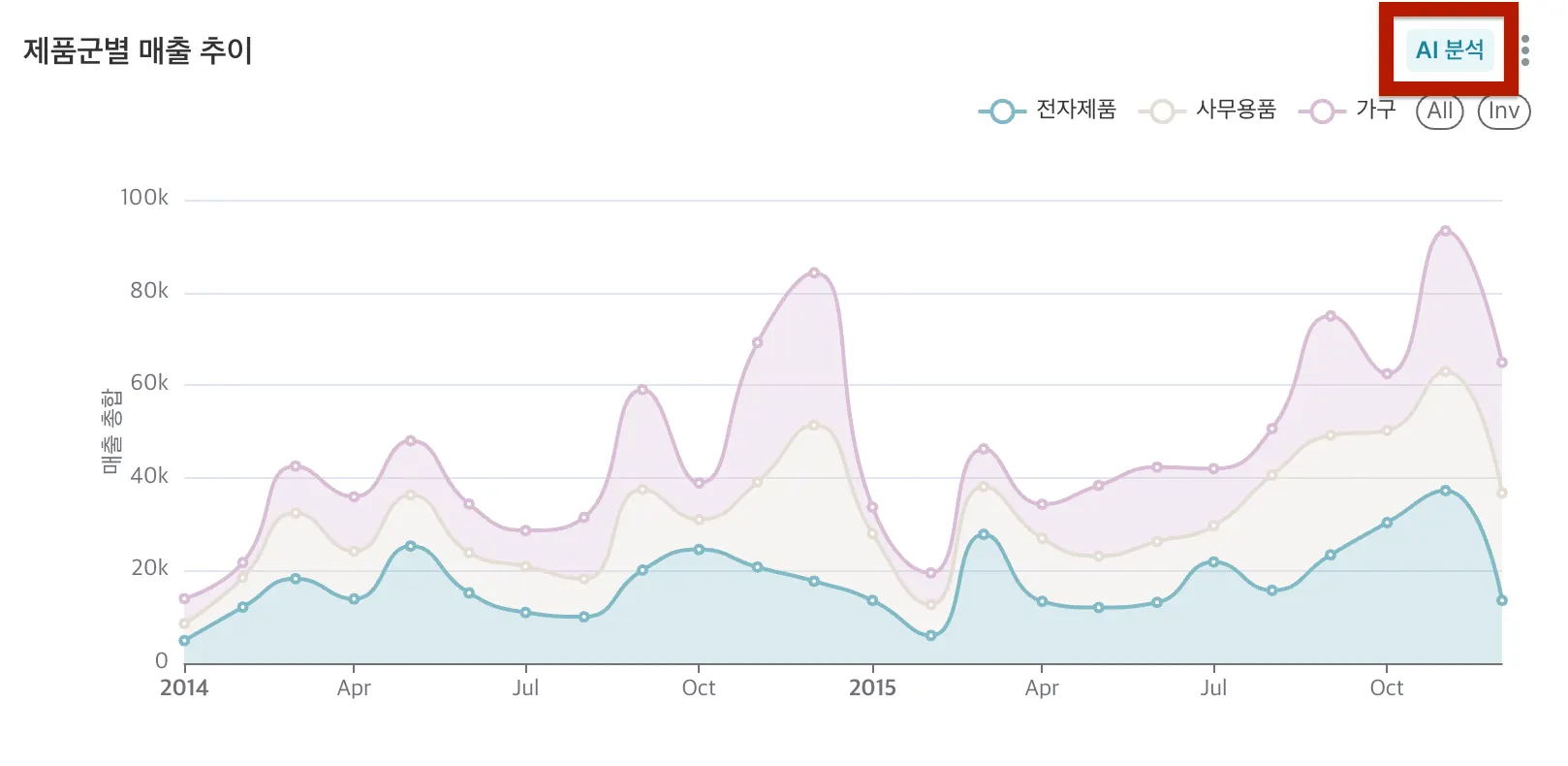 대시보드에서 AI 분석 버튼을 활성화하여 BI부터 Analytics까지 쉽고 빠르게 데이터를 탐색해보세요.