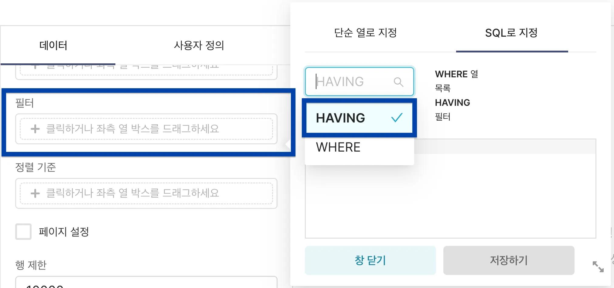 단, 필터에서 “HAVING” 조건으로 필터링 할 경우 해당 조건은 제외하고 연동되는 점 참고 부탁드립니다.
