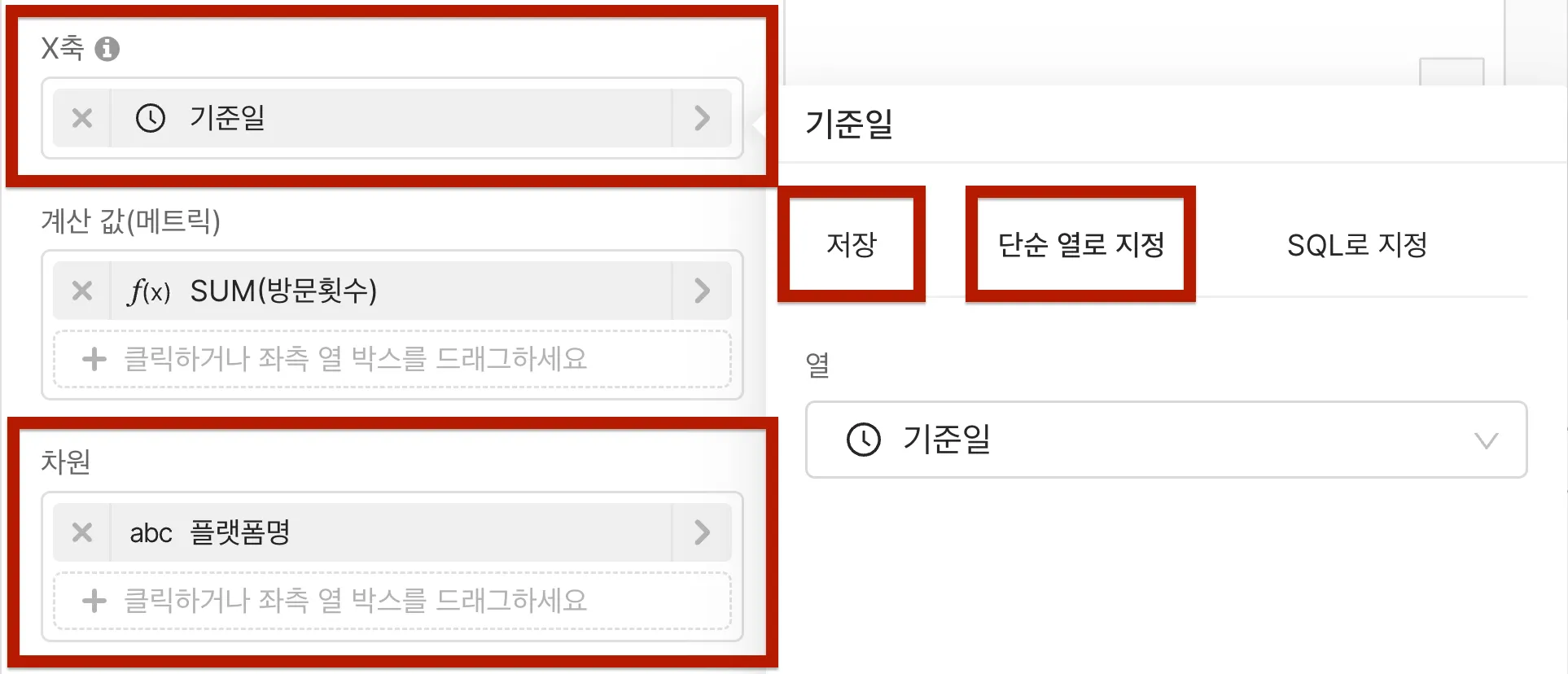 ”SQL로 지정”으로 X축, 차원 설정 시에는 버튼이 비활성화 됩니다.