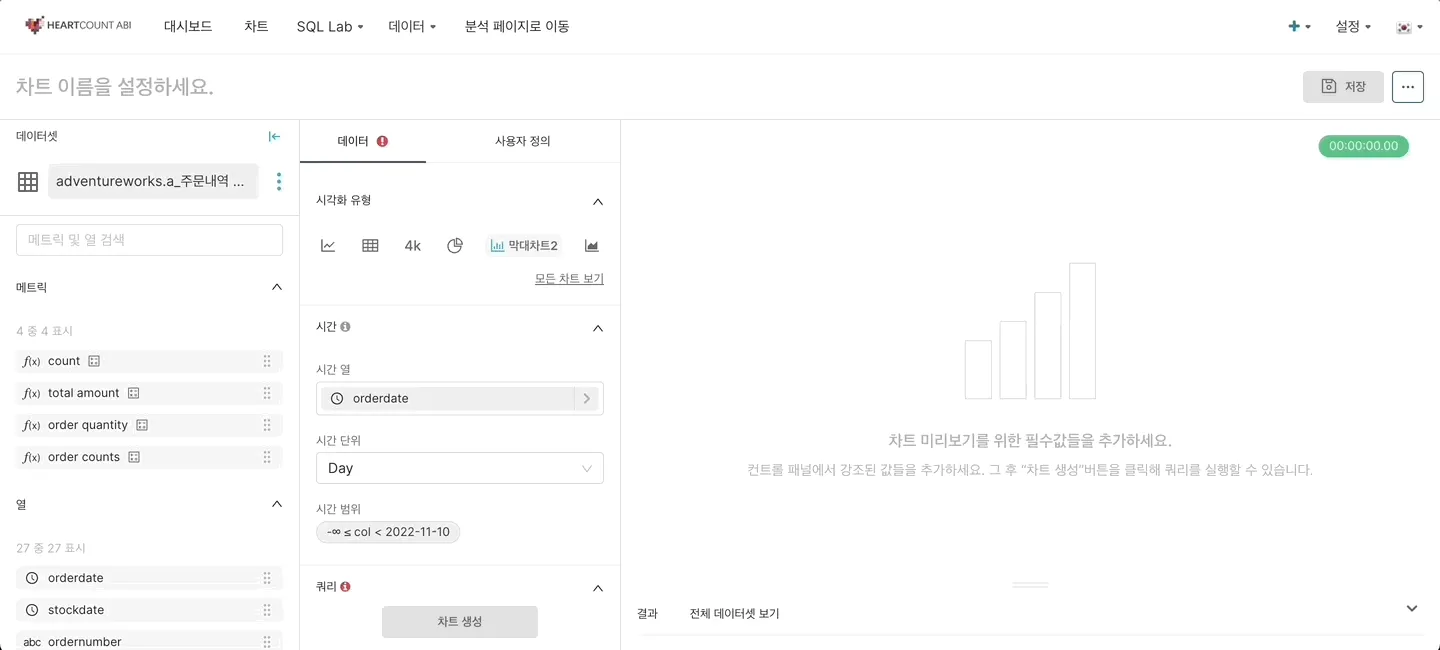1. 시간에 따른 데이터의 변화를 알고 싶다면 시간 열 과 시간 단위, 시간 범위를 설정해줍니다.