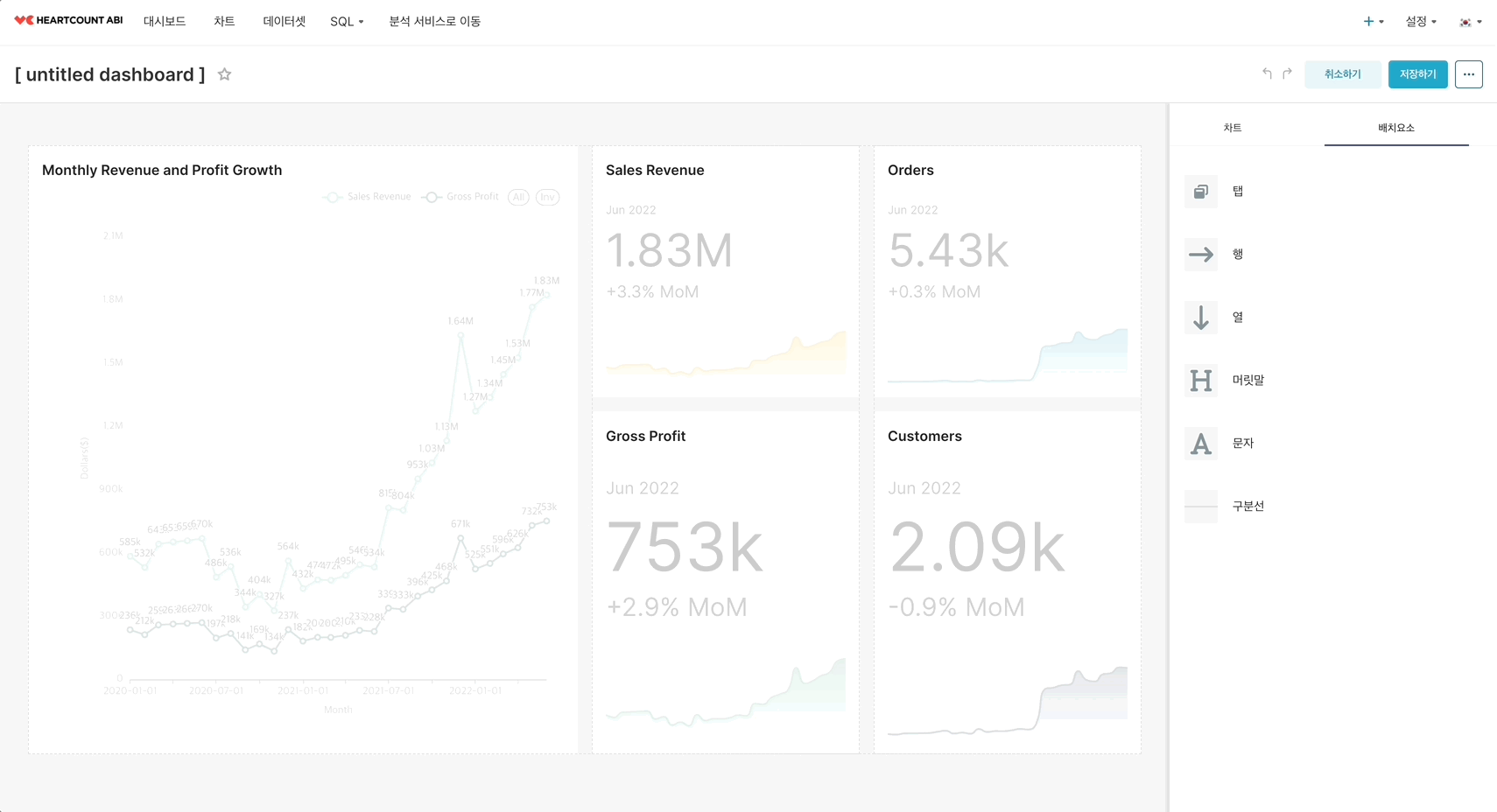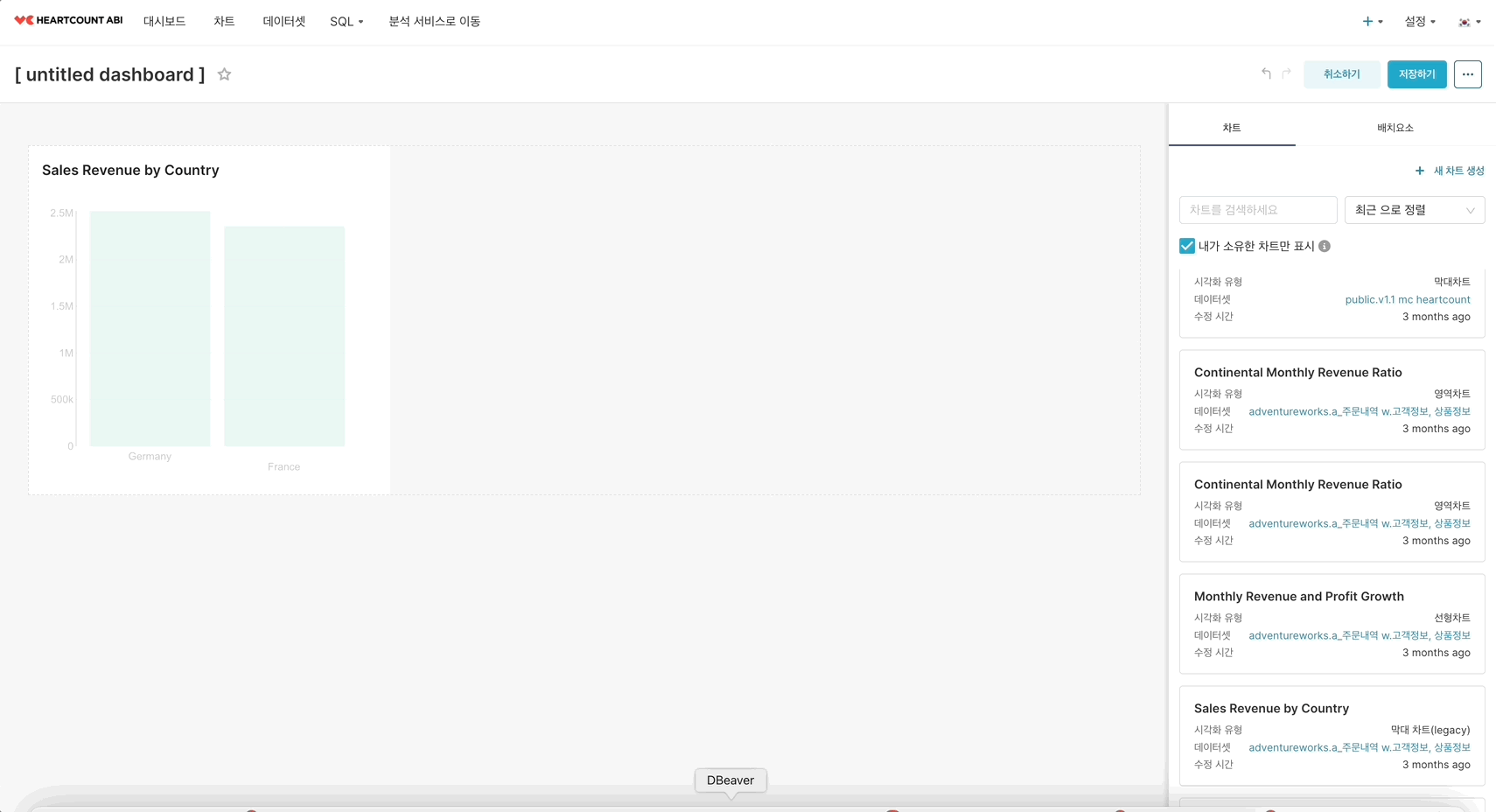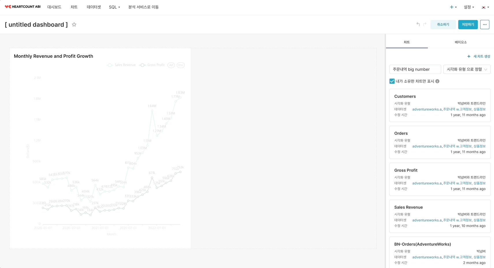 대시보드 편집 화면 우측의 차트 카드를 원하는 차트 영역으로 드래그하고,