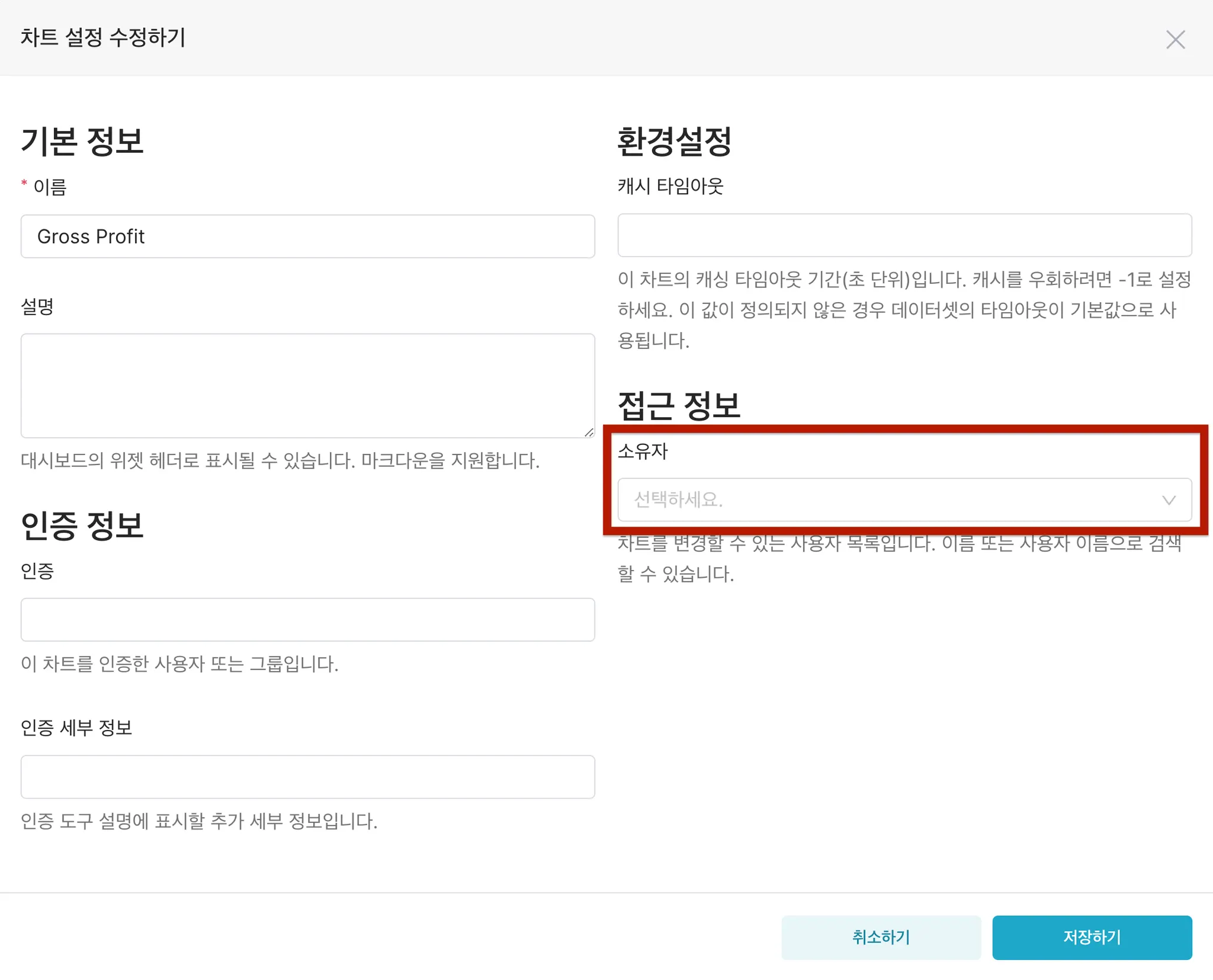 “차트 설정 수정하기” 화면에서 소유자 항목에 차트 편집 권한을 부여하려는 사용자를 추가합니다.
