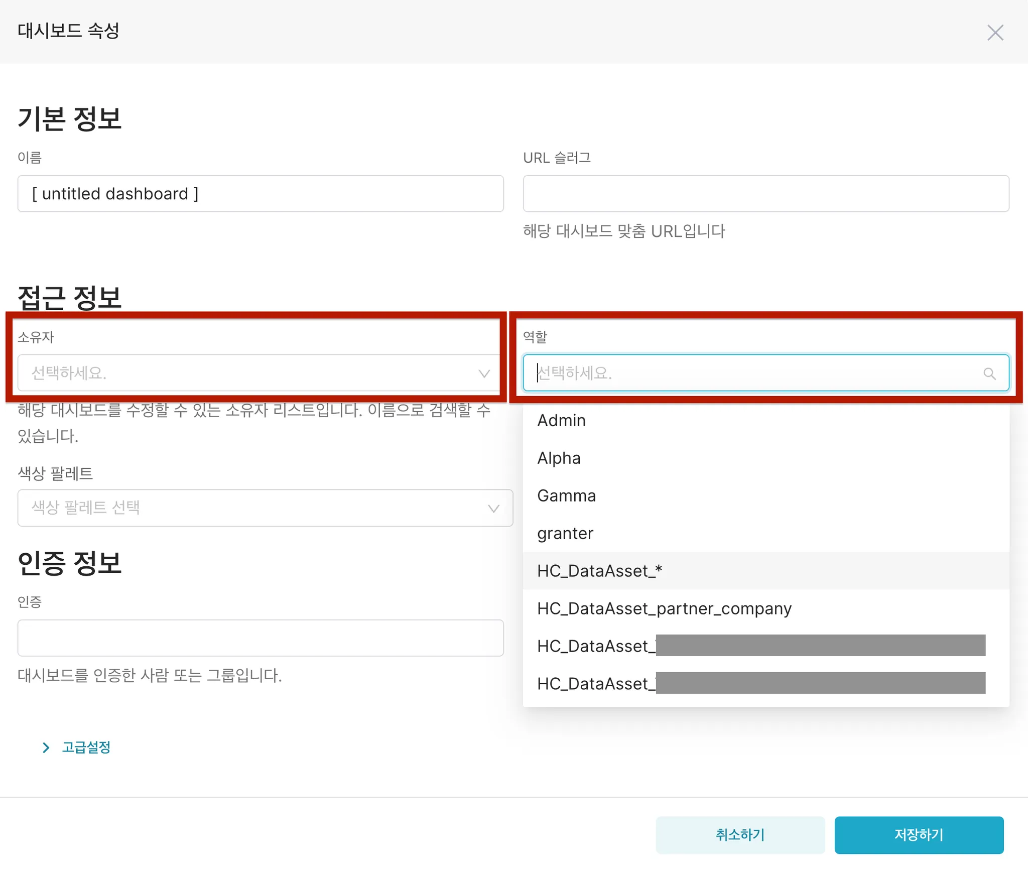 역할 항목에 지정된 역할을 가진 사용자는 해당 대시보드를 조회 할 수 있습니다.