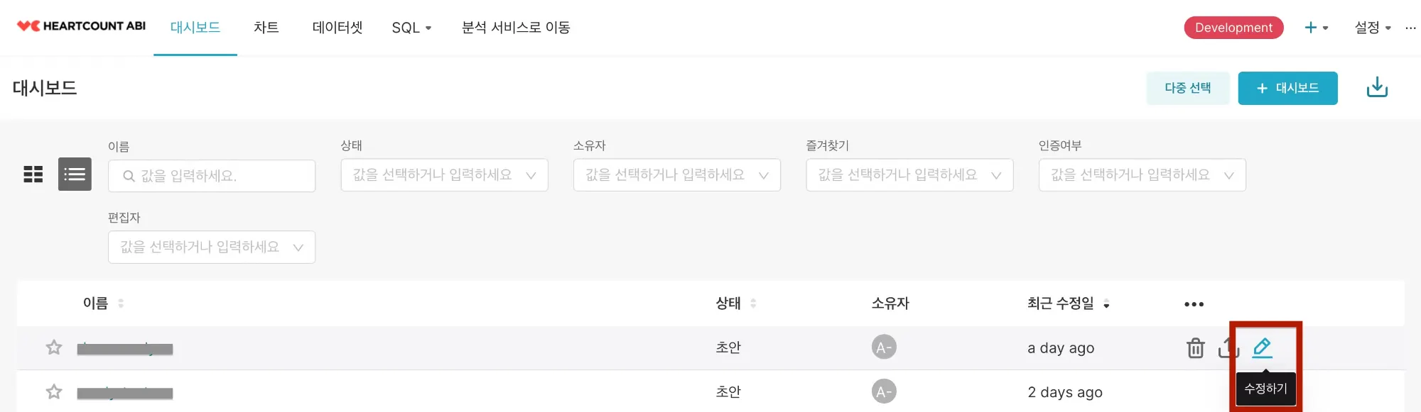 조회 및 편집 권한을 부여하려는 대시보드에 마우스를 오버하여, 수정하기 버튼을 클릭합니다.
