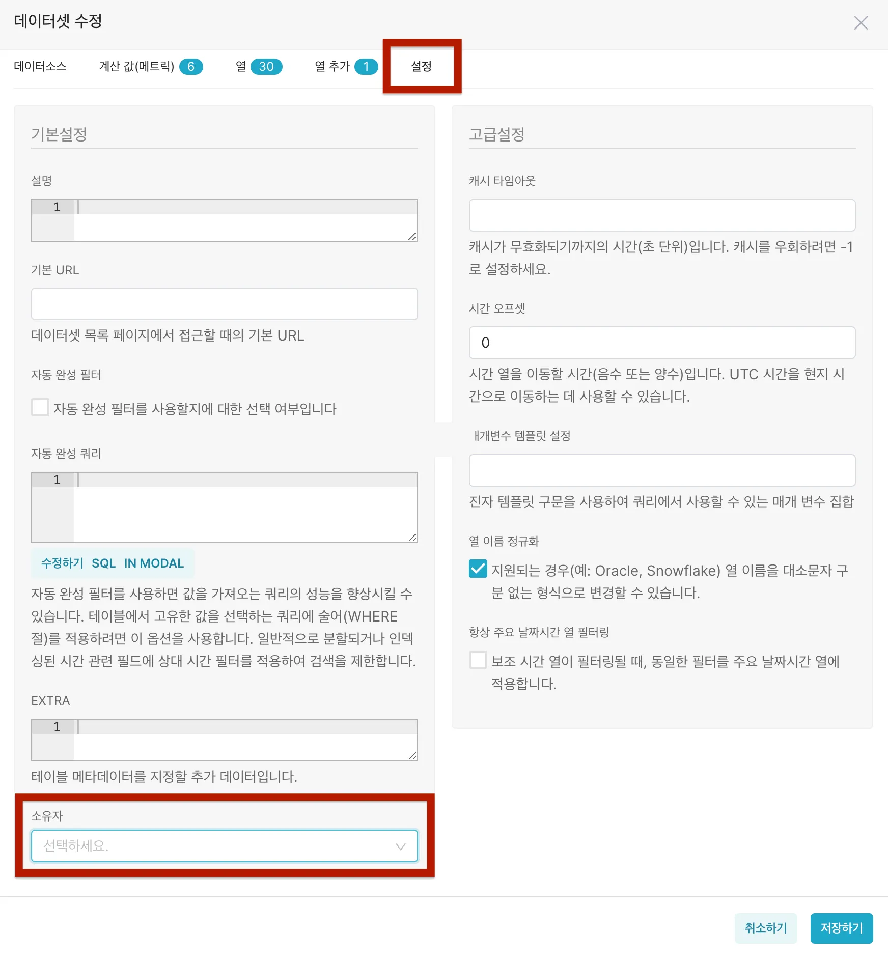 “데이터셋 수정” 창의 “설정” 탭에서 소유자 항목에 차트 편집 권한을 부여하려는 사용자를 추가합니다.
