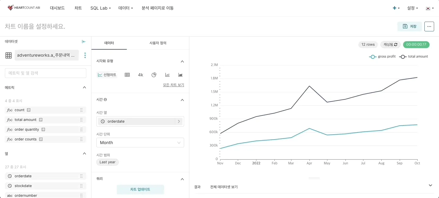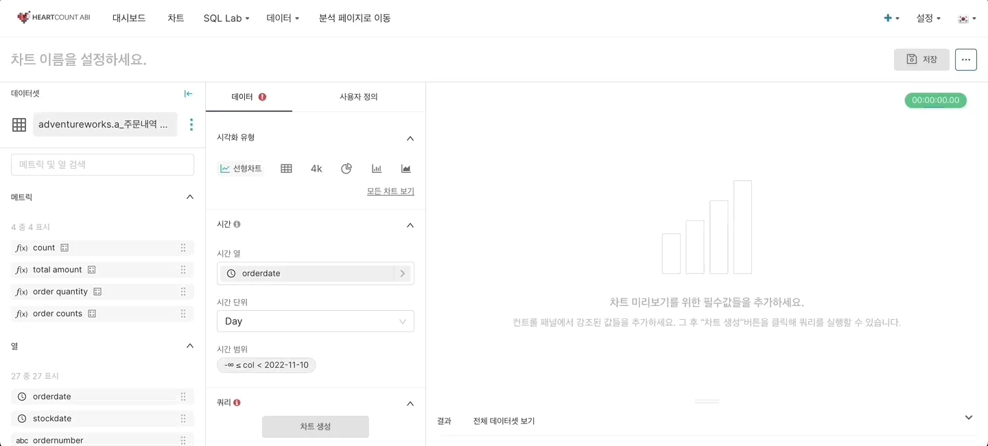 1. 시간에 따른 데이터의 변화를 알고 싶다면 시간 열과 시간 단위, 시간 범위를 설정해줍니다.