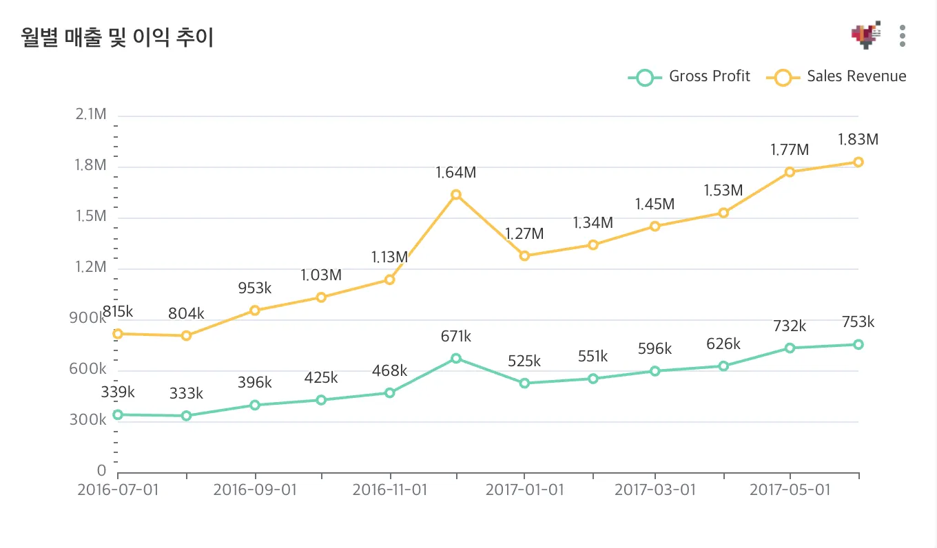 시간에 따른 값의 변화를 나타낼 때 사용하기 좋은 차트입니다.