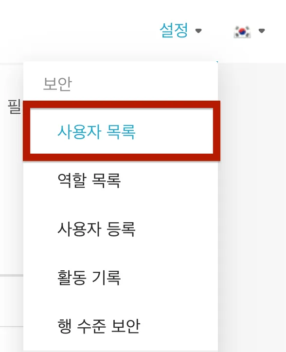 우측 상단의 설정 ▾ → 사용자 목록 메뉴를 클릭합니다.