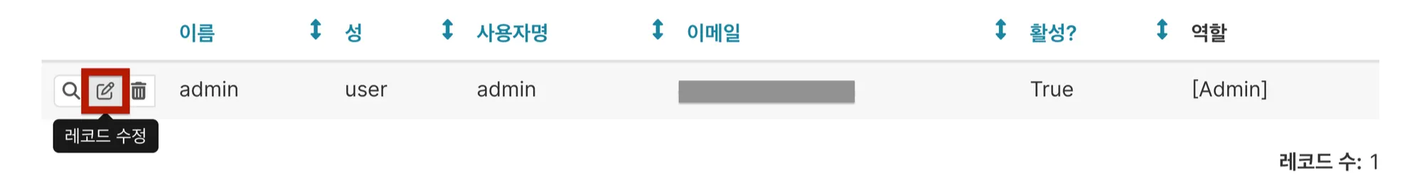 데이터 접근 권한을 부여하려는 사용자의 레코드 수정 아이콘을 클릭합니다.