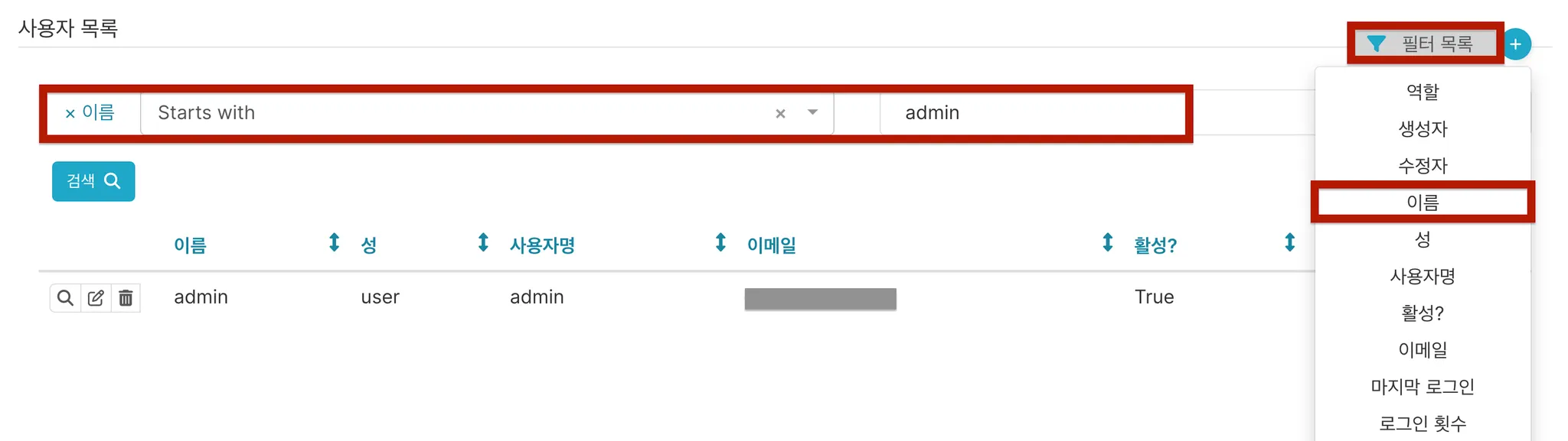 필터 목록에서 조회할 기준을 클릭한 후 조건을 검색하면 사용자를 쉽게 검색할 수 있습니다.