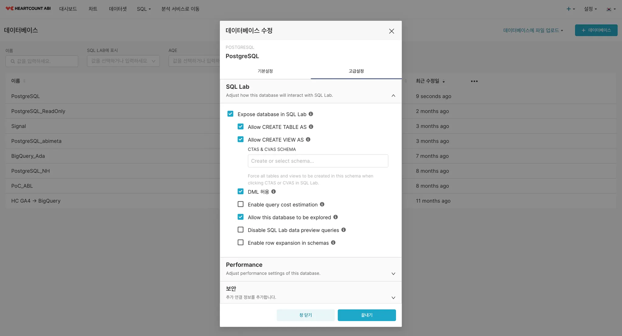 생성된 테이블과 뷰를 저장하는 스키마 지정하는 화면 (설정 - 데이터베이스 연결 - 수정하기 - 고급설정 - SQL Lab - CTAS & CVAS SCHEMA)