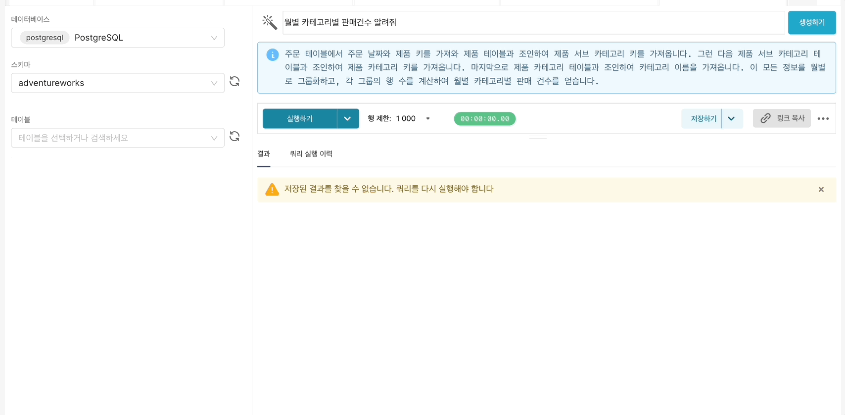 해당 데이터셋을 DB에 물리적 테이블 또는 뷰로 저장하려면, 실행하기 우측 화살표 버튼을 클릭하세요.