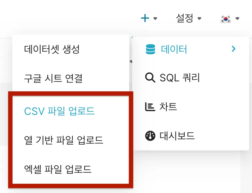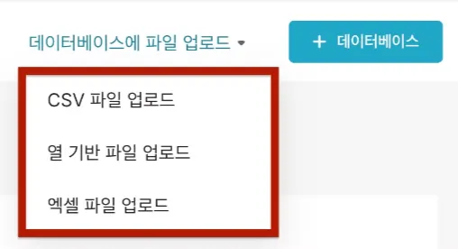 - 방법 1. (화면 우측 상단) 설정 ▾ → 데이터베이스 연결 → 데이터베이스에 파일 업로드 ▾ → 업로드할 파일 선택