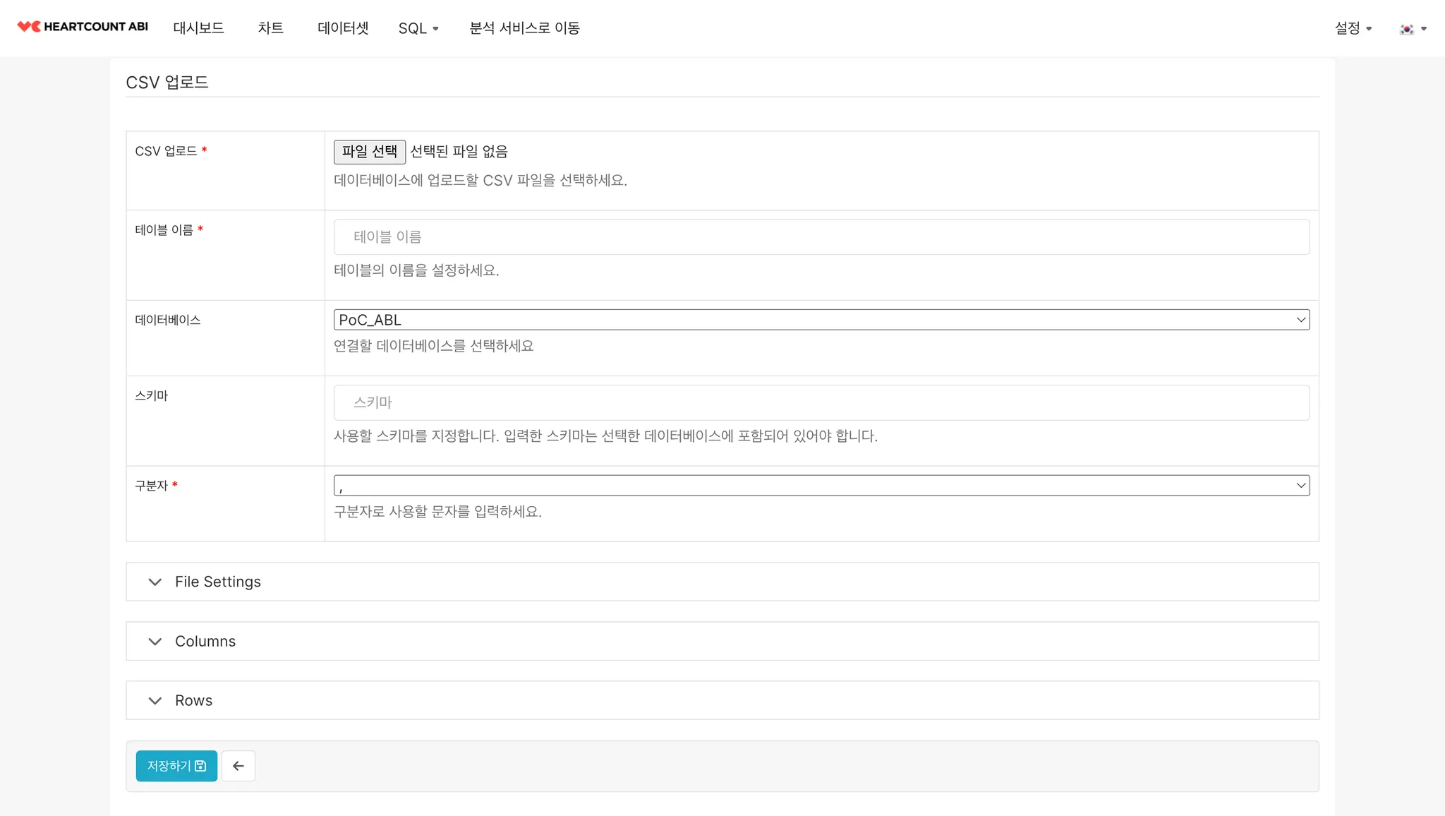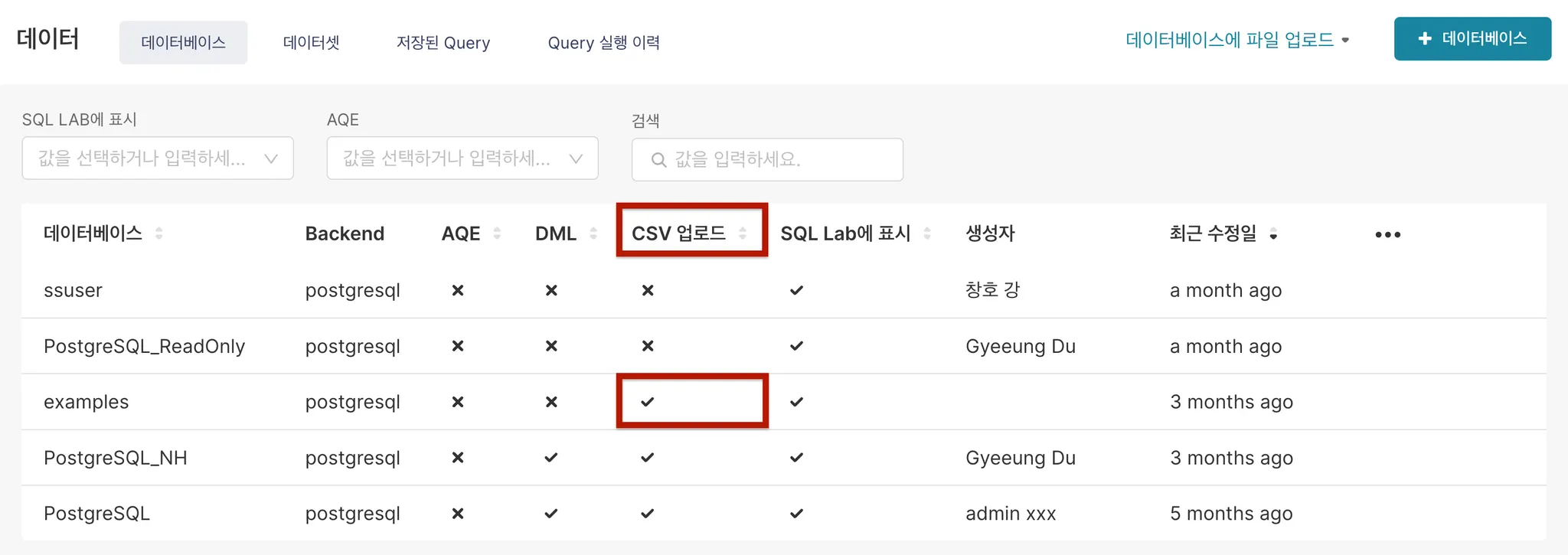 설정한 데이터베이스의 CSV 업로드 항목이 체크되어 있는지 확인합니다.