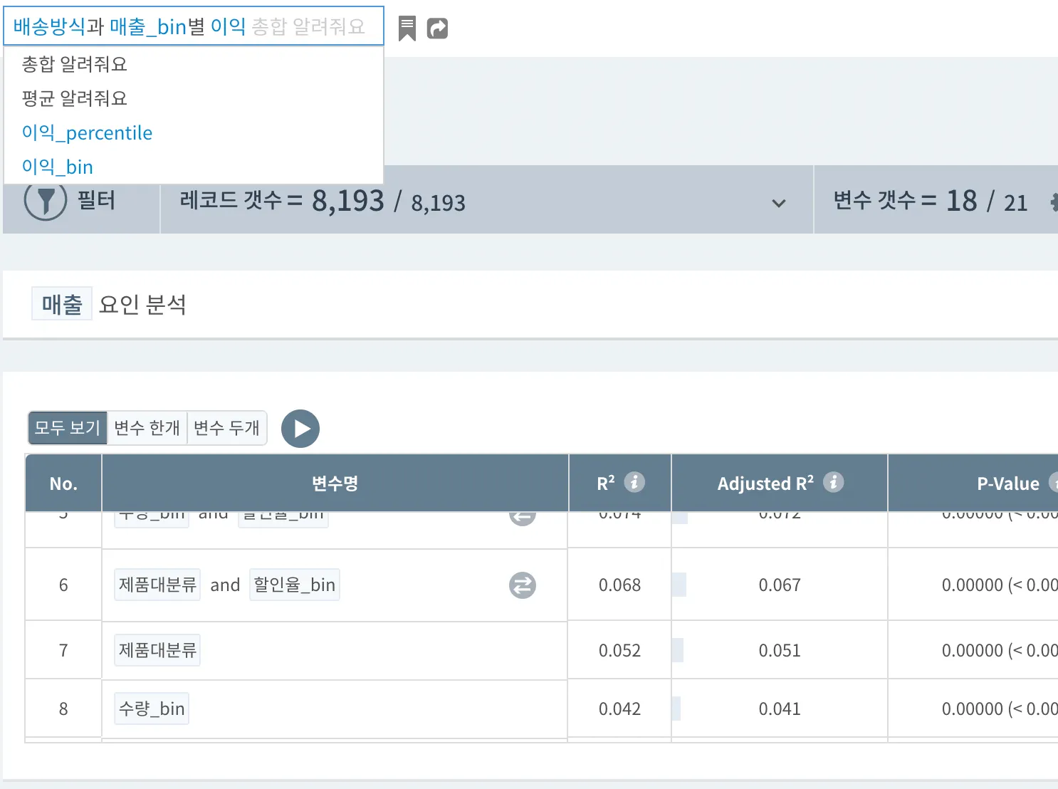 가설없이 분석한 결과를 통계적으로 유의미하고 KPI에 큰 영향을 미치는 요인 순으로 제공하여 이용자가 익숙한 관점과 시각으로만 데이터를 보는 한계를 보완할 수 있습니다.