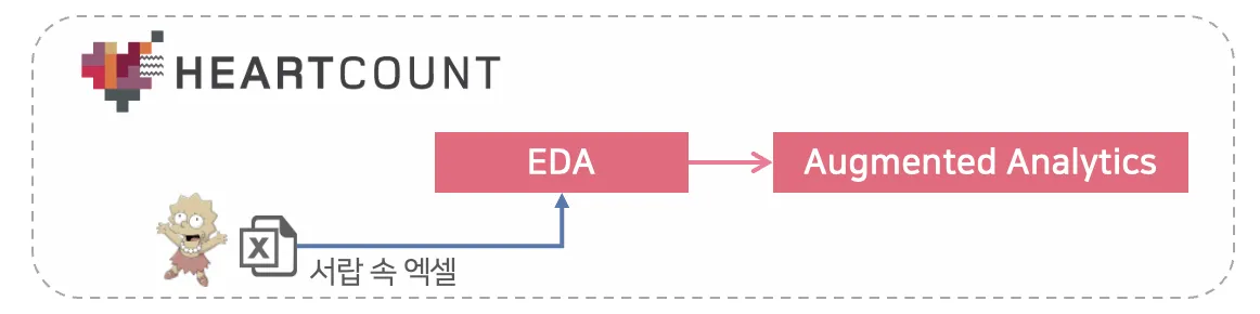 좋은 도구가 없으면, 우리가 도구처럼 사용 될 수 있습니다. HEARTCOUNT(하트카운트)는 (데이터에 대한 전문 지식이 부족하더라도) 보통의 사람들이 애쓰지 않고 데이터 활용의 주체가 될 수 있는 도구입니다. EDA 기능을 사용하여 데이터를 거시적/미시적으로 관찰하며 정량적 사실과 변수들 간의 관계를 확인할 수 있고, Augmented Analytics(증강 분석) 기능으로 데이터에 담긴 구조와 질서를 자동으로 발견할 수 있습니다.