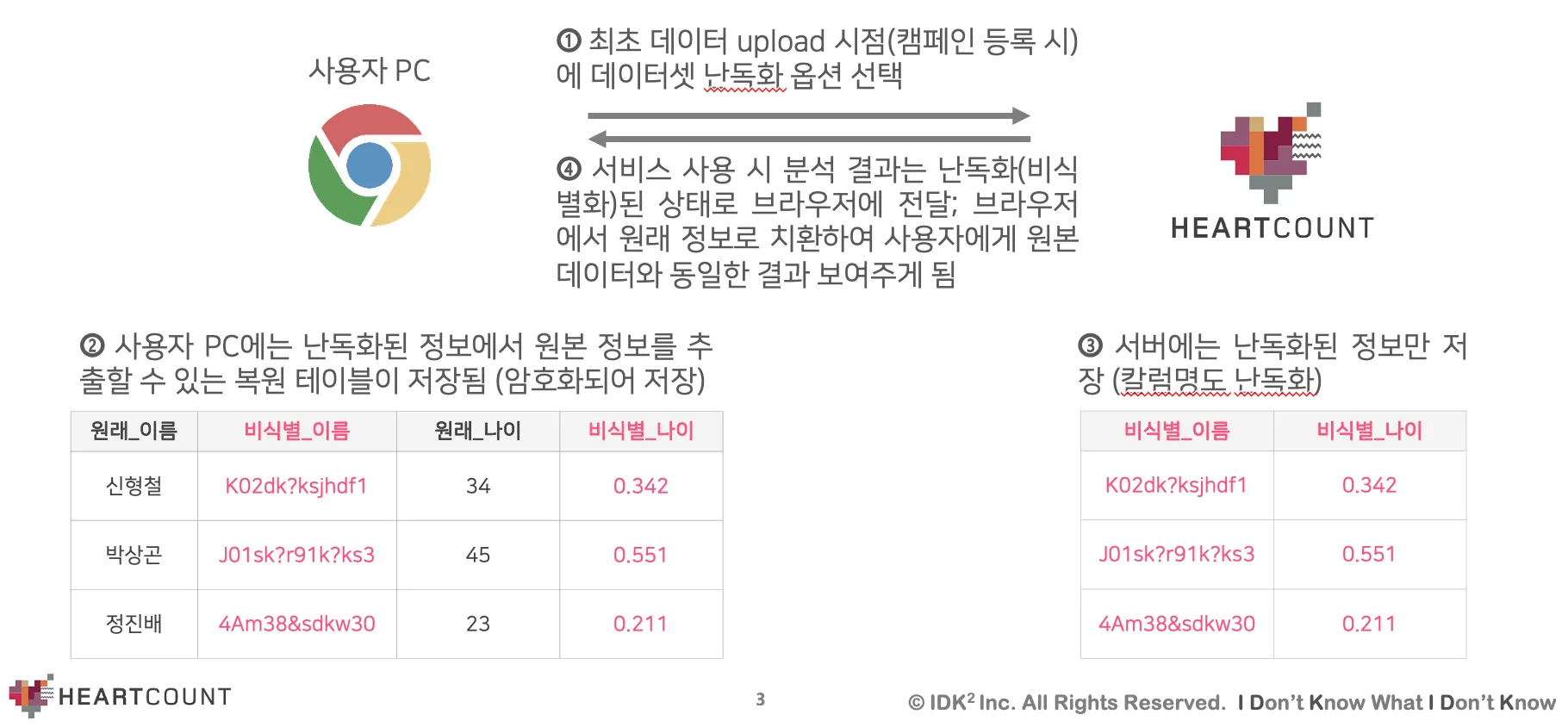 하트카운트 서버에 데이터셋이 업로드됩니다. 이 경우에도 캠페인 저장과 함께 ‘데이터 난독화’ 플래그를 설정해주시면, 난독화된 데이터만 서버에 업로드되어 실제 데이터셋이 유출되지 않습니다. 엄격한 사내 보안 정책 때문에 클라우드 데이터 분석 도구 사용이 어려웠던 분들, 걱정 뚝!