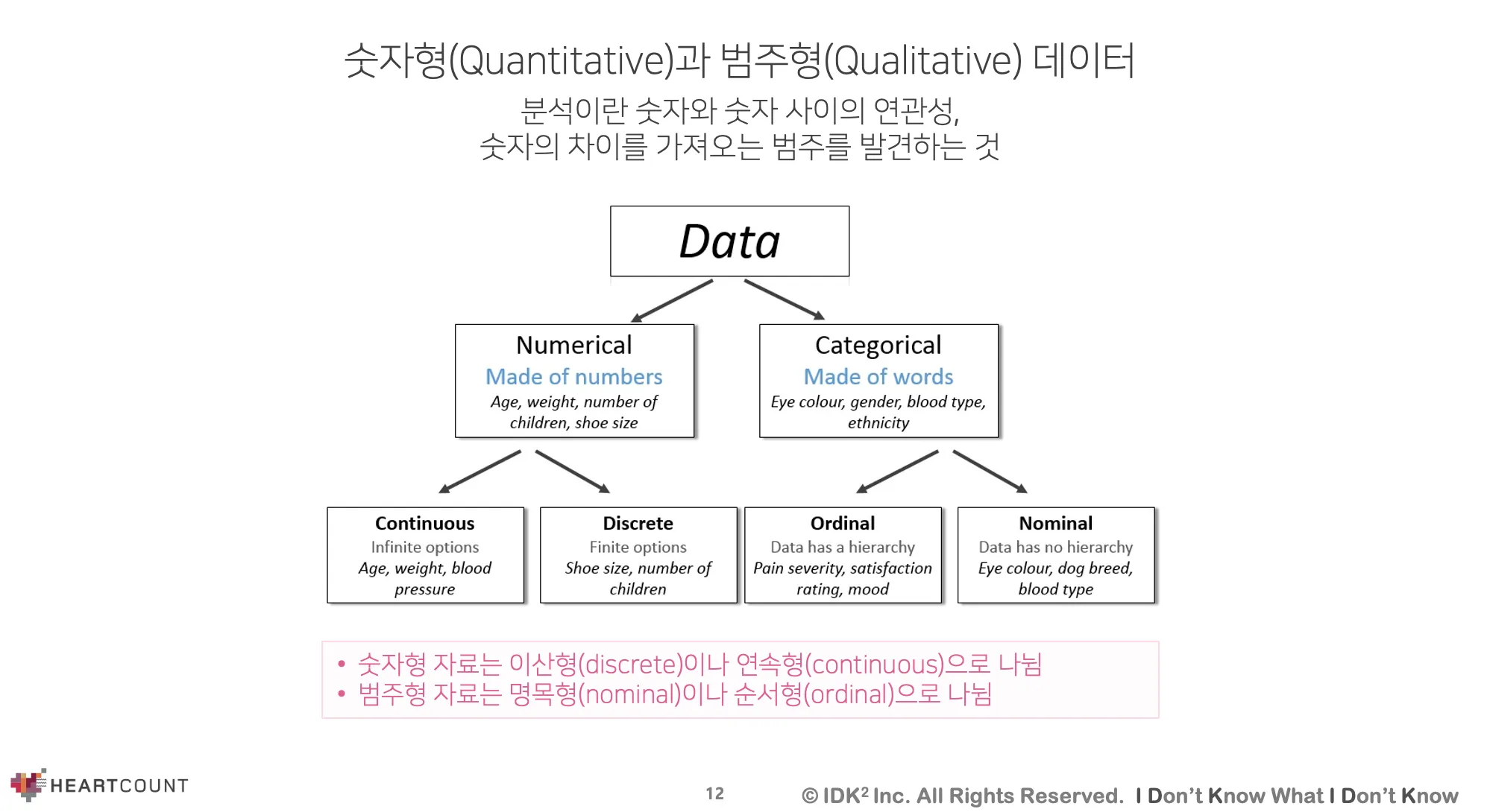 숫자형(Numerical) 데이터(변수)는 크게 이산형(discrete)이나 연속형(continuous)으로 나뉩니다. 하지만, 실무 맥락에서 둘 간의 구분은 그닥 중요하지 않으니 참고 정도만 해주시면 되겠습니다.
