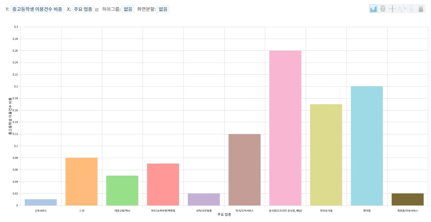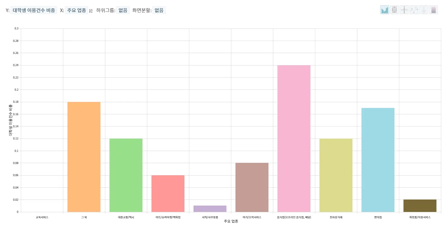 대학생의 이용건수는 음식점(오프라인 음식점, 배달), 그 외, 편의점 순으로 많았으며, 이용금액은 음식점(오프라인 음식점, 배달), 전자상거래, 그 외 순으로 높았습니다.