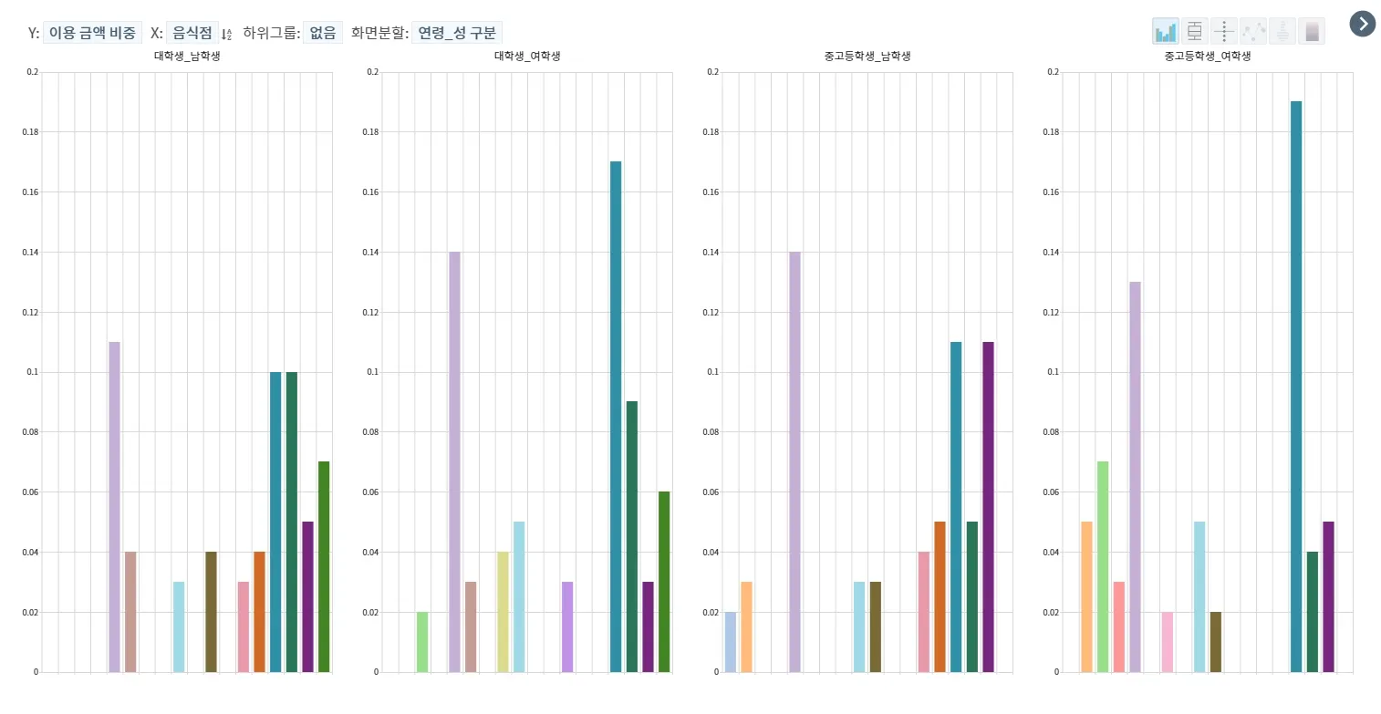음식점 & 이용 금액 비중을 연령 및 성 구분으로 분석 결과, 대학생_남학생은 1) 배달/야식전문점 2) 커피전문점, 한식/백반집 순으로 높았으며, 대학생_여학생은 1) 커피전문점 2) 배달/야식전문점 3) 한식/백반집 순으로 높았습니다.