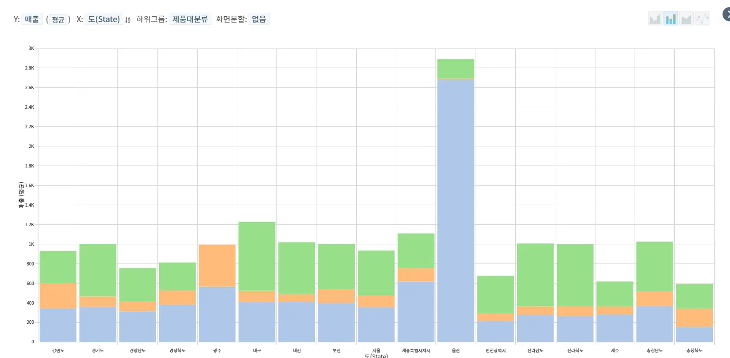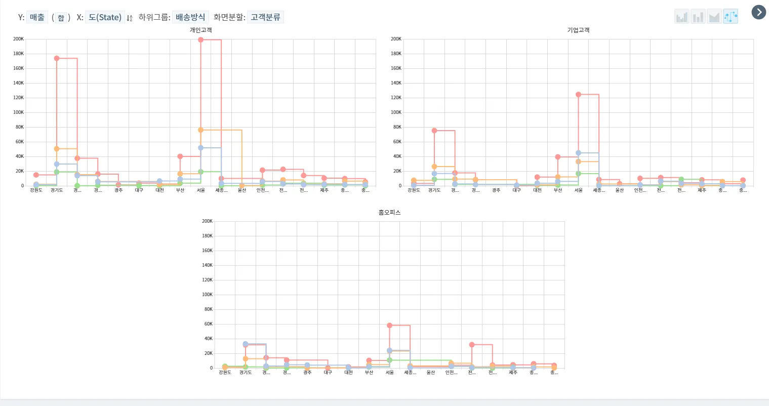 매출기여 큰 고객분류: 1. 지역별 1.카테고리 >> 매출: Y / 배송방식: X = 등을 분석하여,