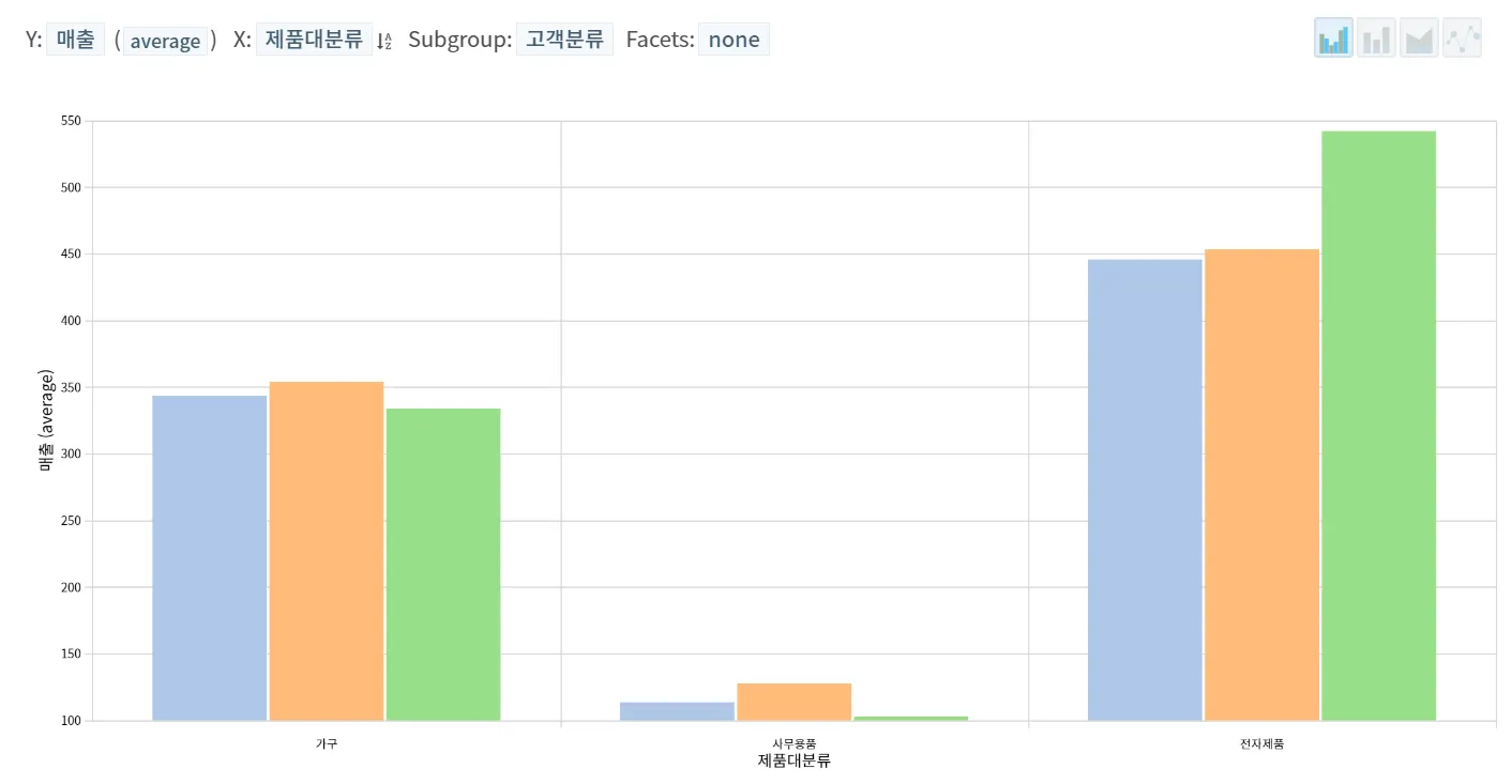 매출 기여순) 1.전자제품 2.사무용품 3.가구용매출기여 로 나와, 전자제품의 매출이 커보입니다.