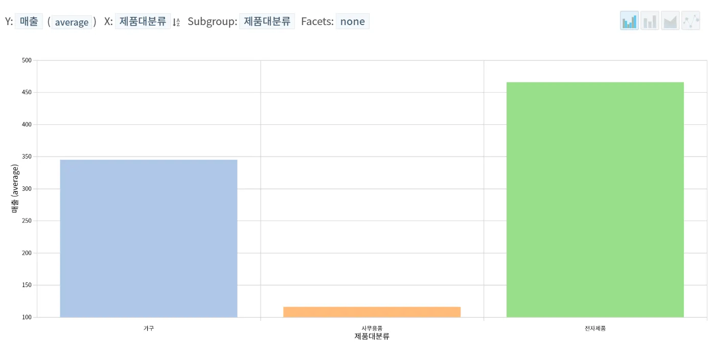 => 판매 우선순위는 전자제품 > 사무용품 > 가구 순으로 정하고, 전자제품 및 사무용품 중 이익이 적은 상품은 판매 중단 또는 신규회원 확보를 위한 저가 중심의 미끼상품으로 활용하는 판매 전략을 취할 수 있음