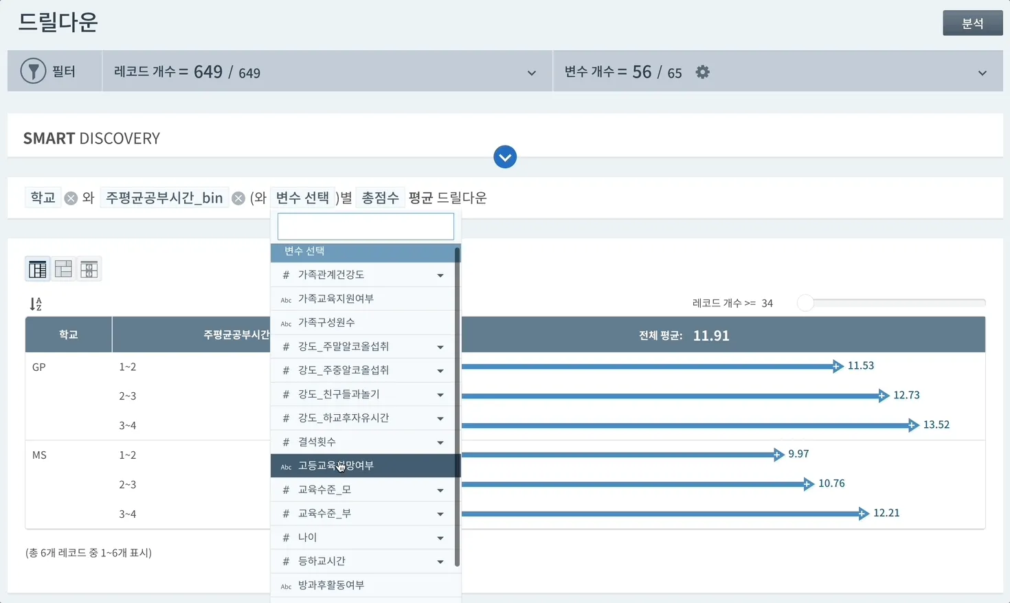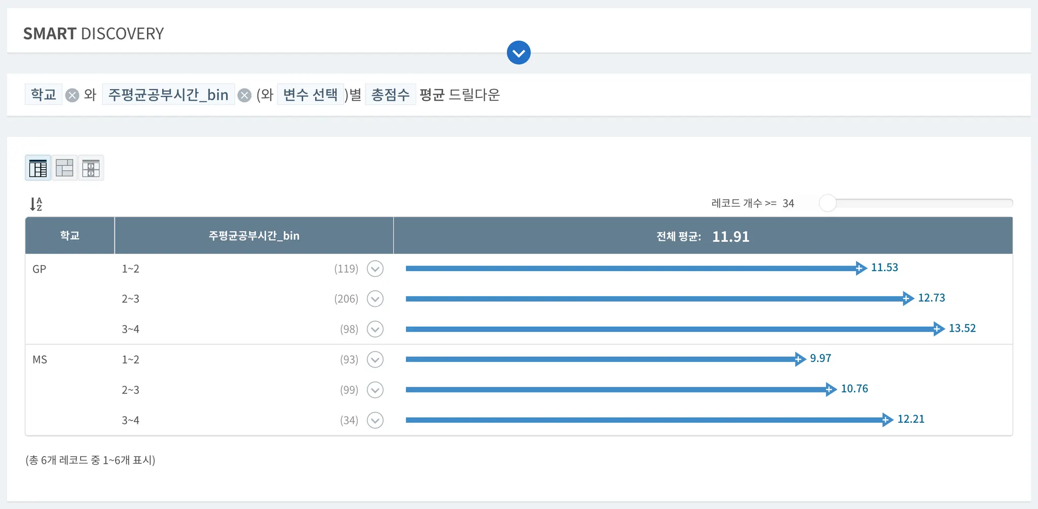고등교육희망여부가 학생의 목표의식이라면, 주평균공부시간은 학생 본인이 실제로 학습에 보이는 의지일 것이다. 이번에는 주평균공부시간으로 나누어보자.