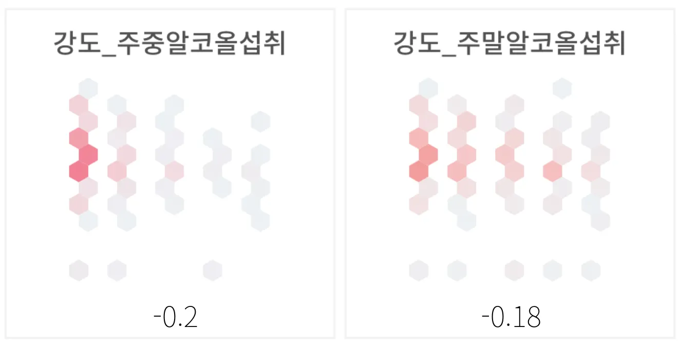 알코올 섭취량이 많을수록 총점수가 낮아지는 약한 음의 상관관계를 보였다. 특히, 주중 알코올 섭취량이 주말 알코올 섭취량보다 총점수와의 상관관계가 더 강했다.